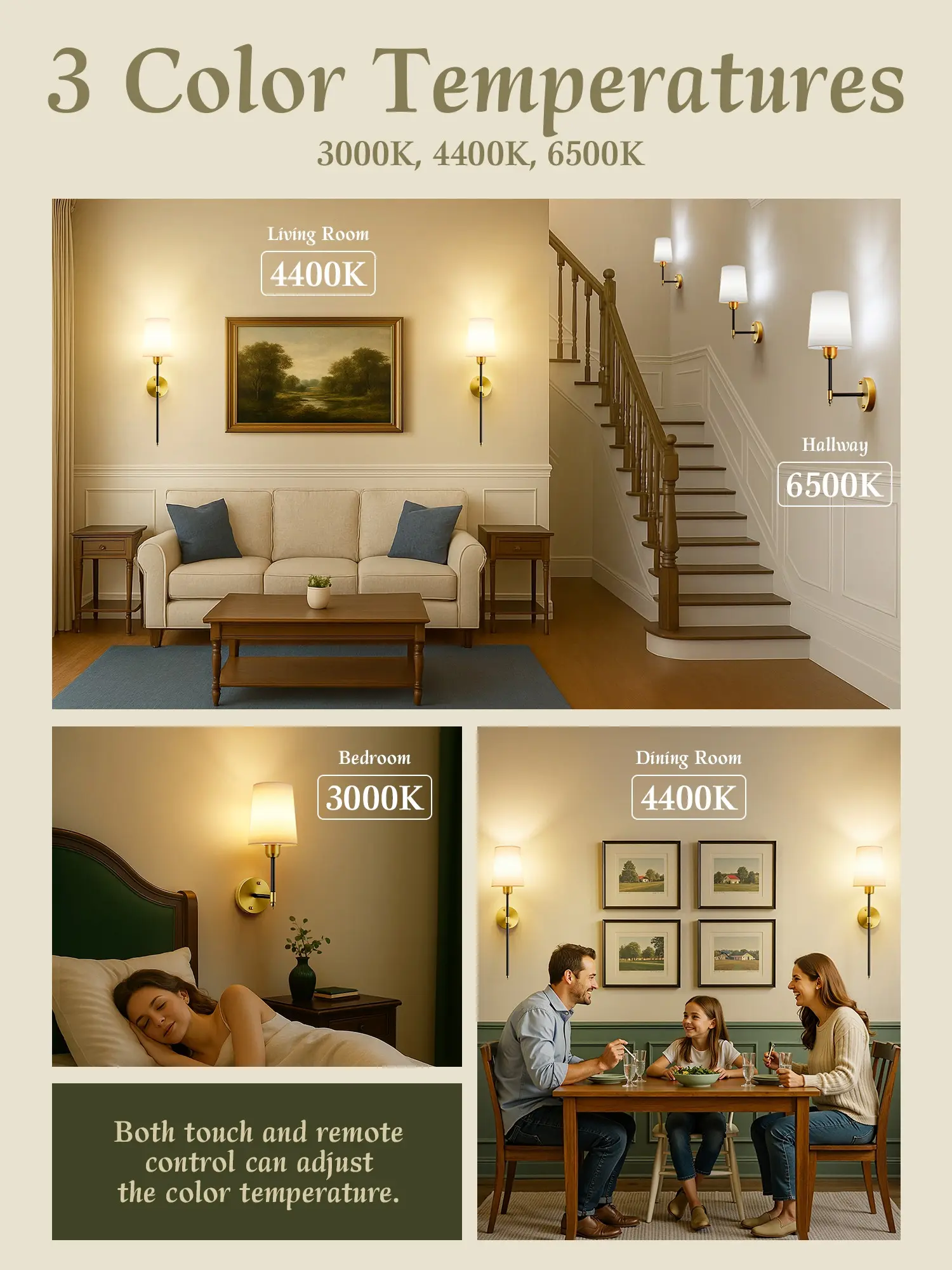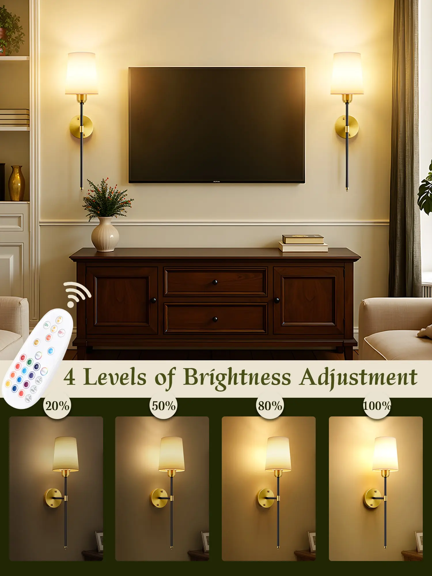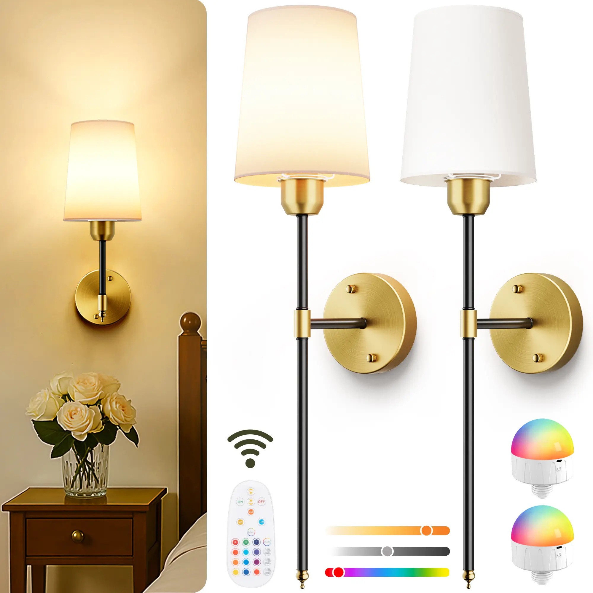 ·[4 Brightness Dimmable, 3 Color Temperatures & 15 RGB Colors] These wall lights are available in 3 color temperatures (warm white, natural white, cool white) to meet all your lighting needs in bedroom, living room, or hallway, etc. In addition, you can ajdust 3 RGB colors by touch control or 15 RGB colors & 2 dynamic modes by remote control to creat a perfect atmosphere for your party or game.