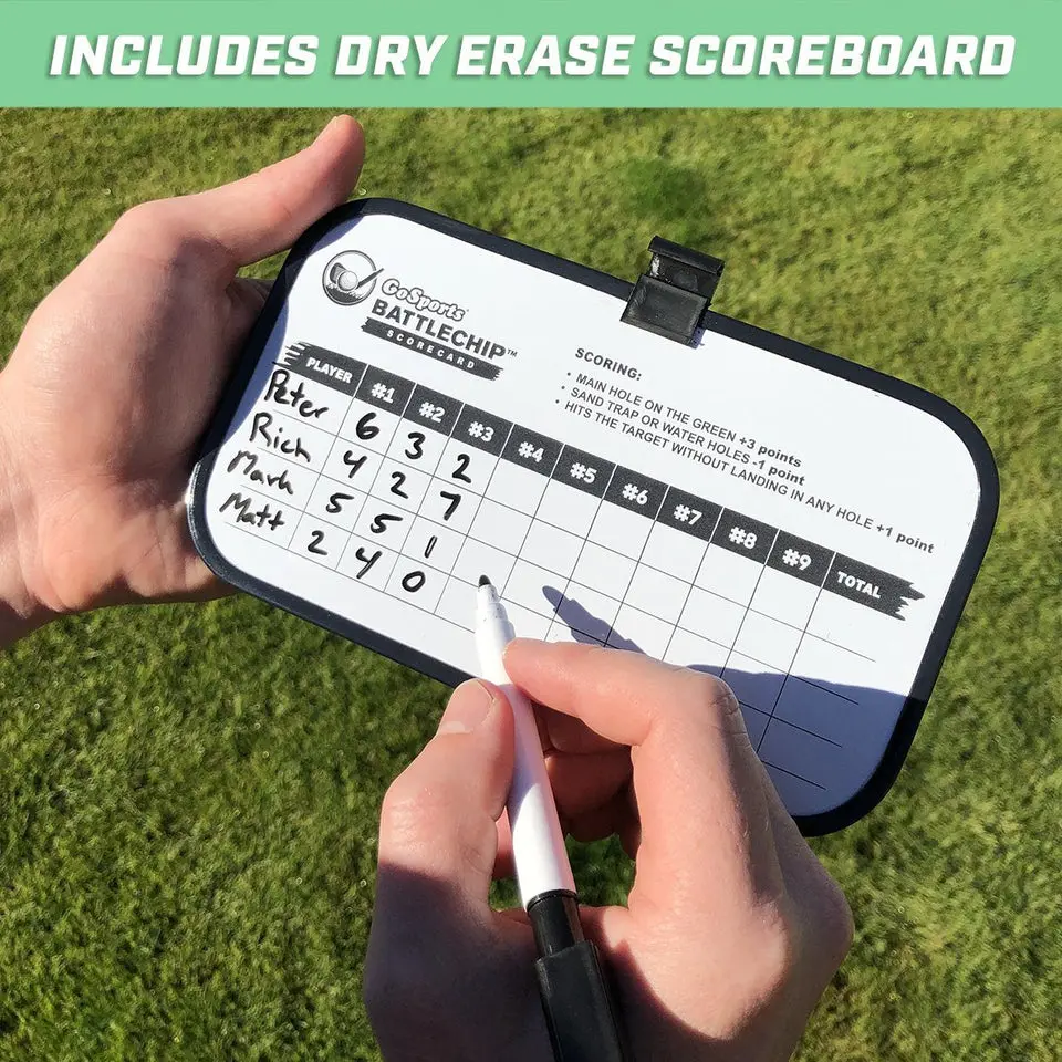 GoSports BattleChip is the ultimate outdoor game that combines the fun of golf with bean bag toss style games! Now you can host your own golf tournament in the backyard and compete over the course of 9 holes with 2-4 players of all skill levels for the title of BattleChip champ! The target is designed with a lightweight yet sturdy 3 ft x 2 ft PVC frame for easy portability and features our unique tear-proof fabric playing surface for durability. The game assembles in seconds so you're ready to start chipping in no time! Just remember to B.Y.O.C. - Bring Your Own Club! We wanted to make BattleChip affordable for everyone to enjoy so there is no club included. In case you don't have one, we recommend a Wedge, Sand Wedge, or Lob Wedge for maximum enjoyment. The game also quickly disassembles and stores neatly into the included carrying case (total weight under 10 lbs), so you can take it to any social gathering or event!