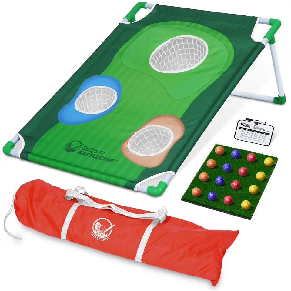 ·BATTLECHIP: An exciting new hybrid between golf and cornhole for the ultimate outdoor game; Easy to learn and fun for all skills levels; Includes 3 foot x 2 foot target, hitting mat, 16 color foam balls and carry case