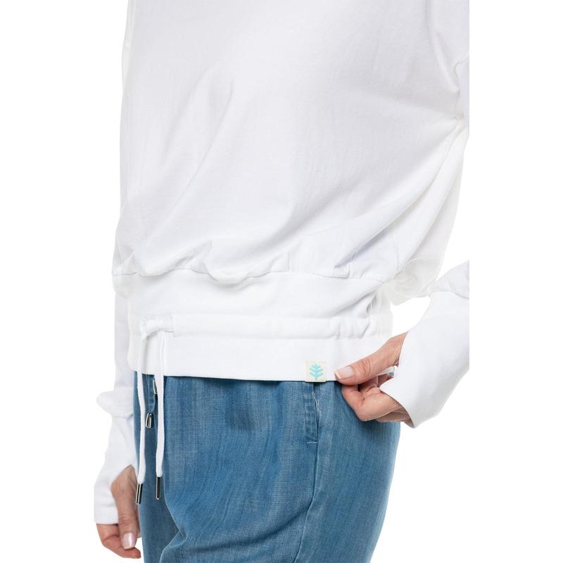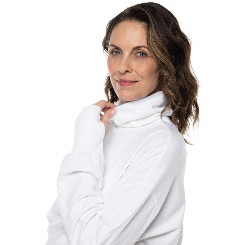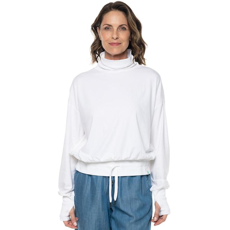 The Bay Harbor Tie Waist Tee is your new everyday go-to for sun-safe style and comfort. Made from our softest ZnO fabric, this lightweight long sleeve features a relaxed fit with a drawstring at the waist, so you can wear it loose or cinched for a more defined shape. The ribbed turtleneck, drop shoulders, and thumbhole cuffs add extra coverage without overcomplicating the look. It’s an easy pick for brunch, lunch with friends, browsing the farmers market, a seaside stroll, or just relaxing on the deck or patio.