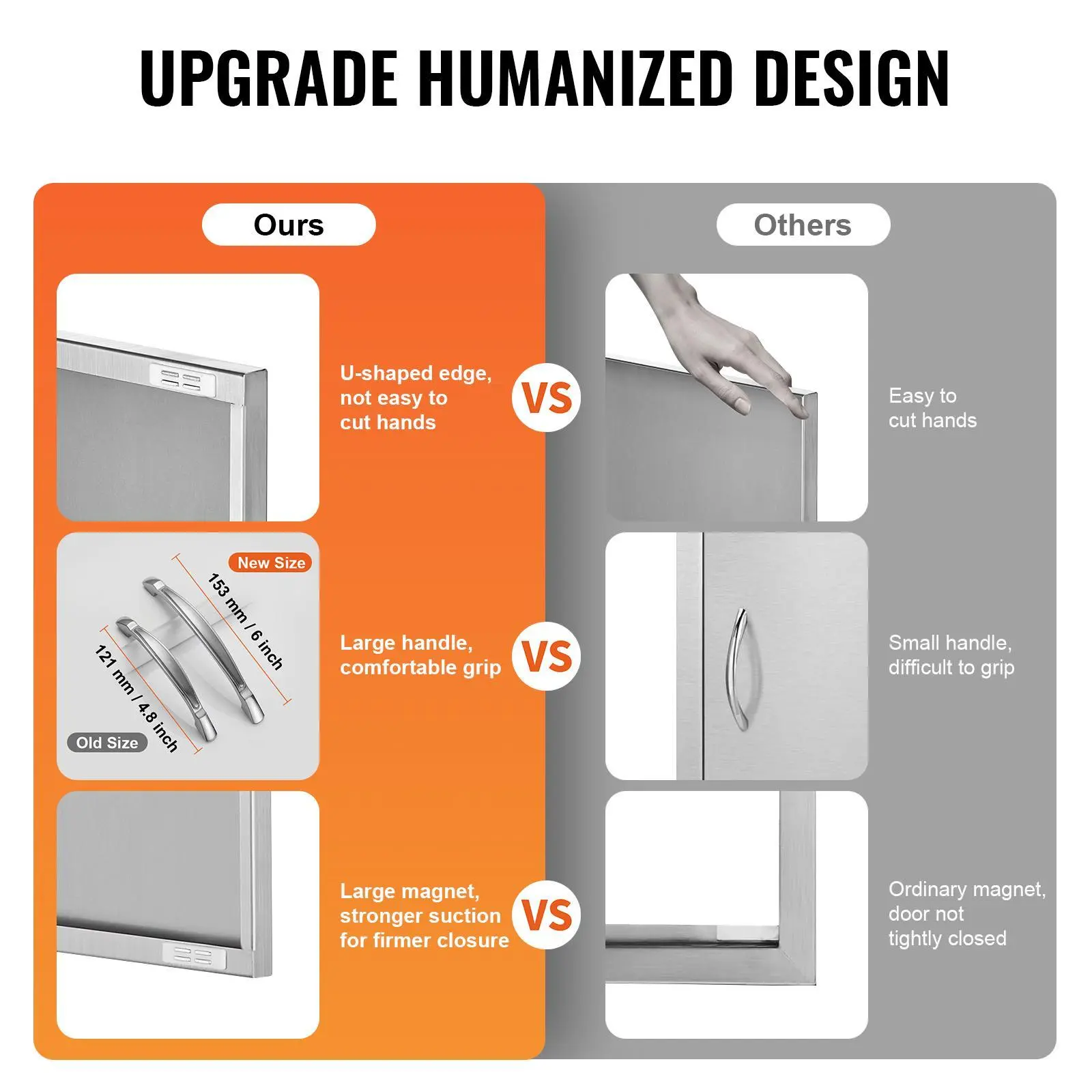 • Humanized Design: Delicate zinc alloy handles conforming to ergonomics, enlarged size for easy opening. The door frame edges are bent and thickened for safer use, providing a more user-friendly experience, allowing you to enjoy cooking in your outdoor kitchen without worries.