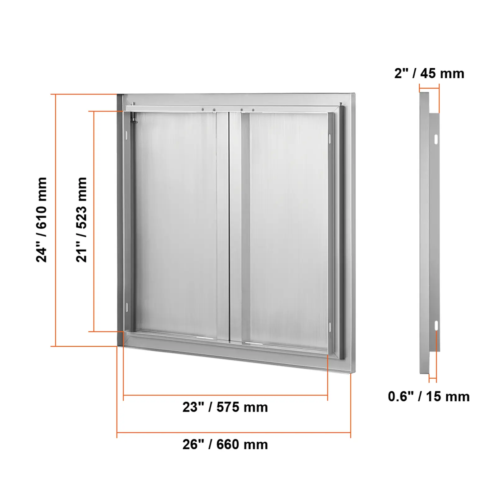 • Precision Opening: Overall dimensions: 660x610x45 mm / 26x24x2 inches, installation size: 23x21inch/575x523mm, it is recommended to reserve an additional 0.08inch/2mm on this basis for better operation. The door is designed specifically for outdoor kitchens and barbecue islands, adding an elegant touch to your cooking area. With precise dimensions, it is easy to process, install, or dismantle. Available in various sizes and styles, it is perfect for indoor/outdoor kitchens and all other outdoor weather conditions.