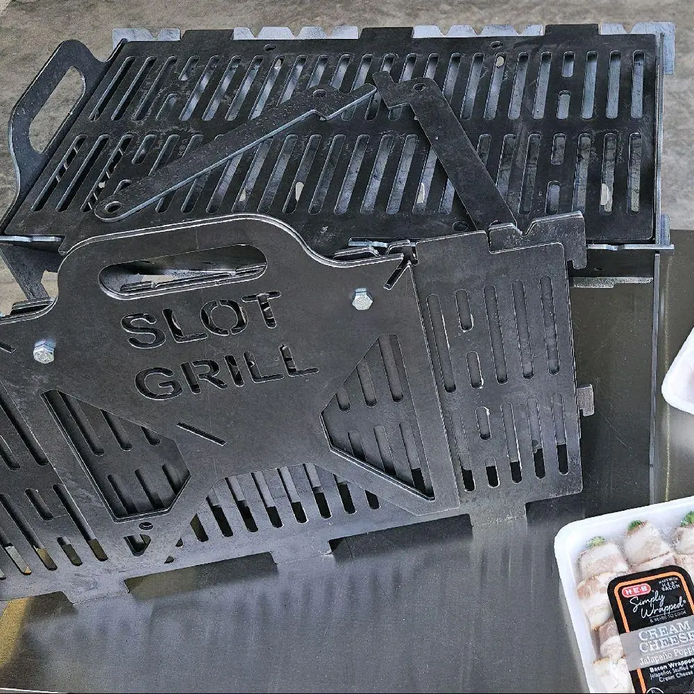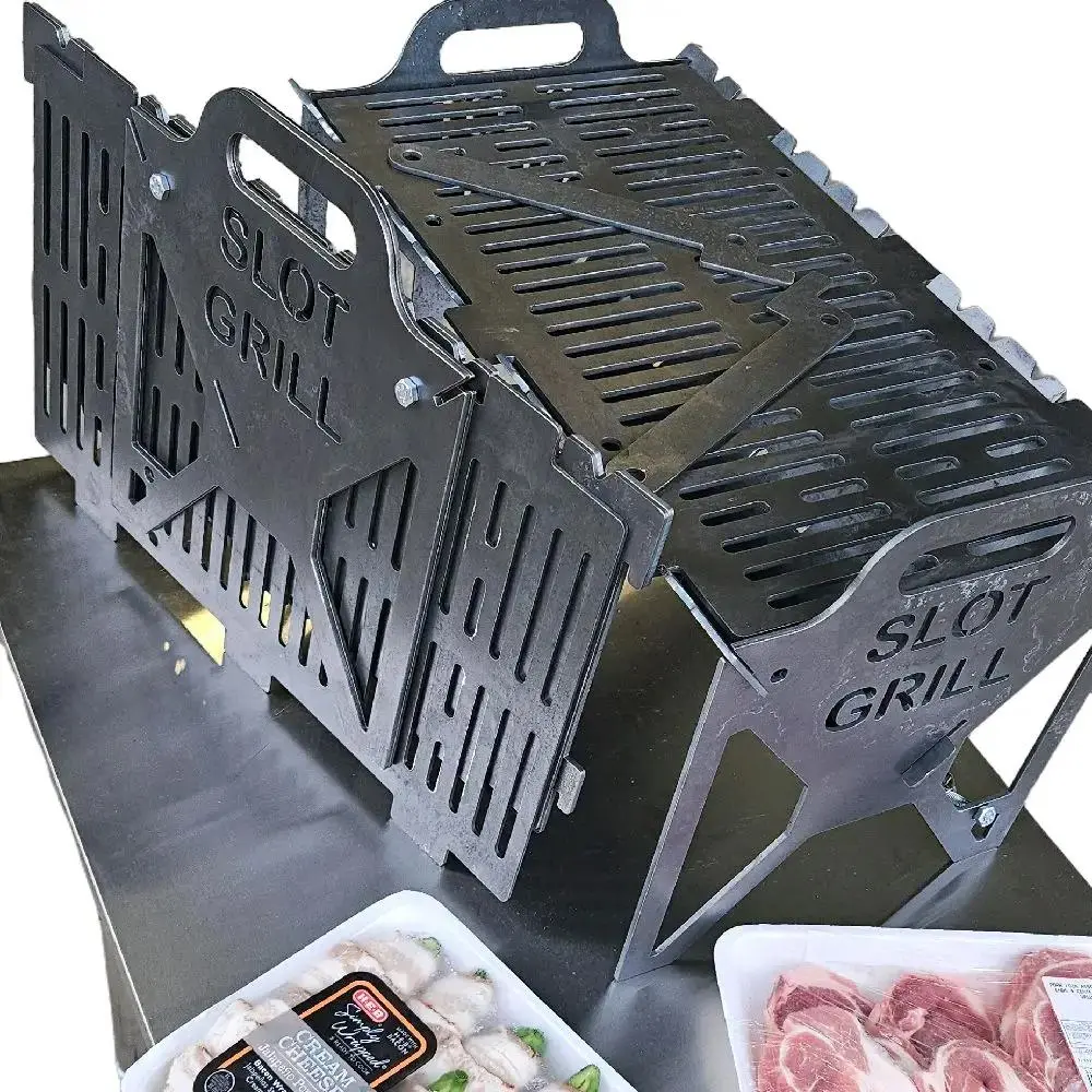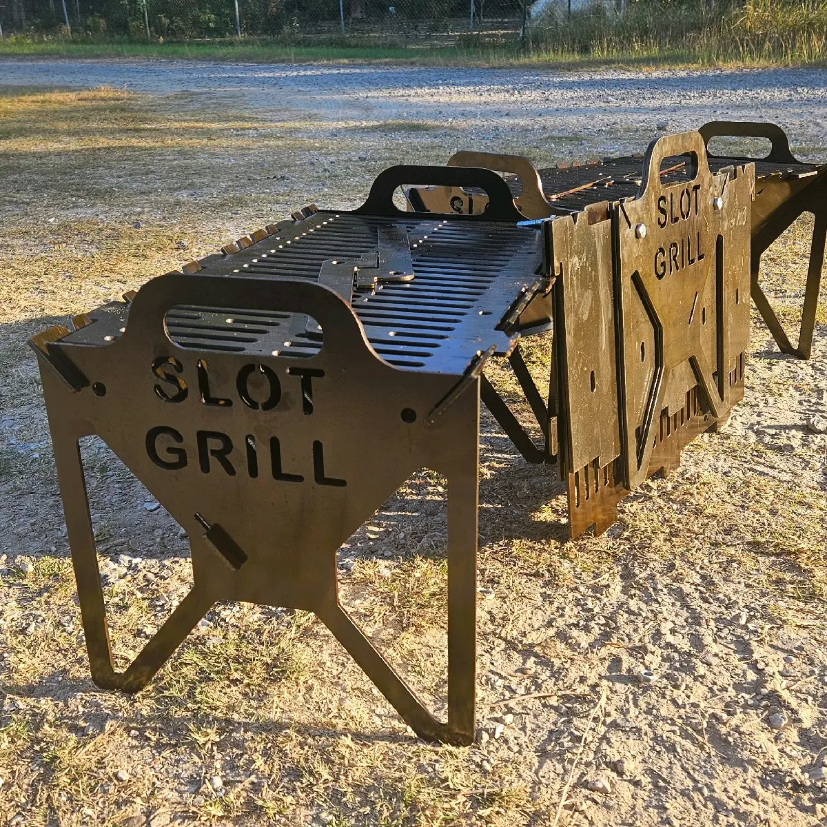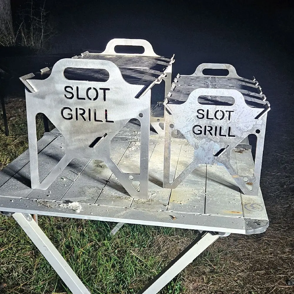 The Compact Slot Grill is designed for portability without sacrificing strength. At 16 by 9 inches of grill surface and weighing approximately 13.5 pounds, it is easy to transport while still being strong enough to support cast iron cookware and real cooking. Made from 12 gauge carbon steel, it is a serious grill in a smaller footprint.