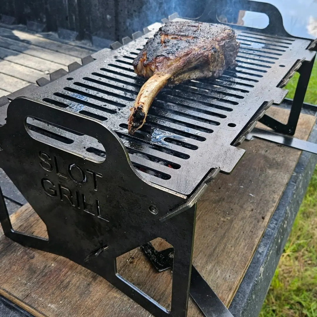 Proudly made in the USA, the Slot Grill is a heavy duty collapsible charcoal grill built from thick carbon steel. No thin materials. No shortcuts. No flimsy overseas junk. It assembles in seconds with no tools required and features an elevated design with a generous air gap underneath to promote airflow while reducing heat transfer to the surface below.
