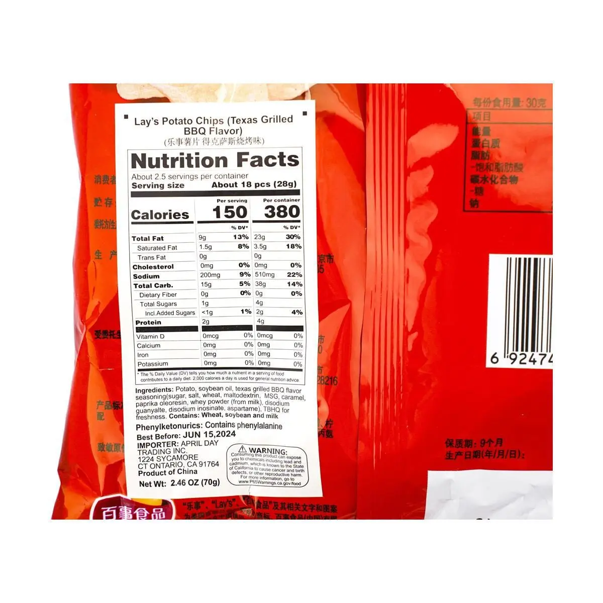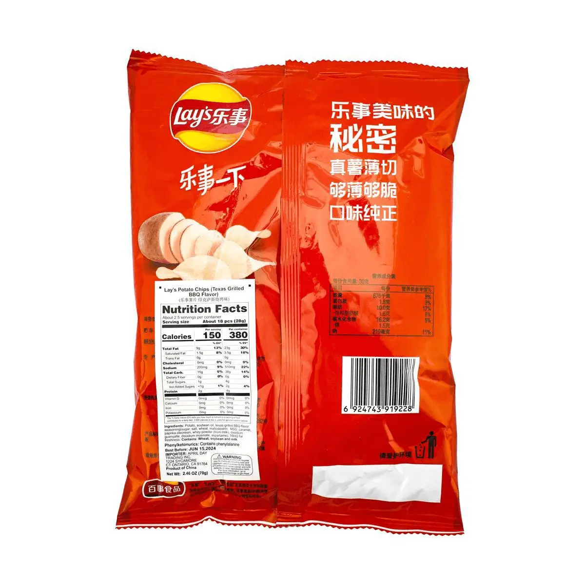 ·Potato Powder, Vegetable Oil, BBQ Seasoning( Maltodextrin, Sugar, Monosoidum Glutamate, Soy Sauce Powder ( Soy Sauce, Maltodextrin, Salt), Salt, Edible Essence, Hydrolyzed Vegetable Protein, Onion, Honey, Spices, Sillicon Dioxide, Artificial Chicken flavoring, Soybean Oil, Yeast Extract, Aspartme, Artificial Beef Flavorings, Whey Powder, Lecithin, Calcium Stearate.