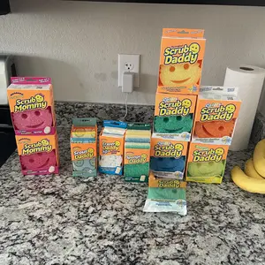 Love these products. The Scrub Daddy is a durable, versatile sponge that changes texture with water temperature—firm in cold, soft in warm. It cleans effectively without scratching and lasts longer than regular sponges. The smiley design is ergonomic and functional.