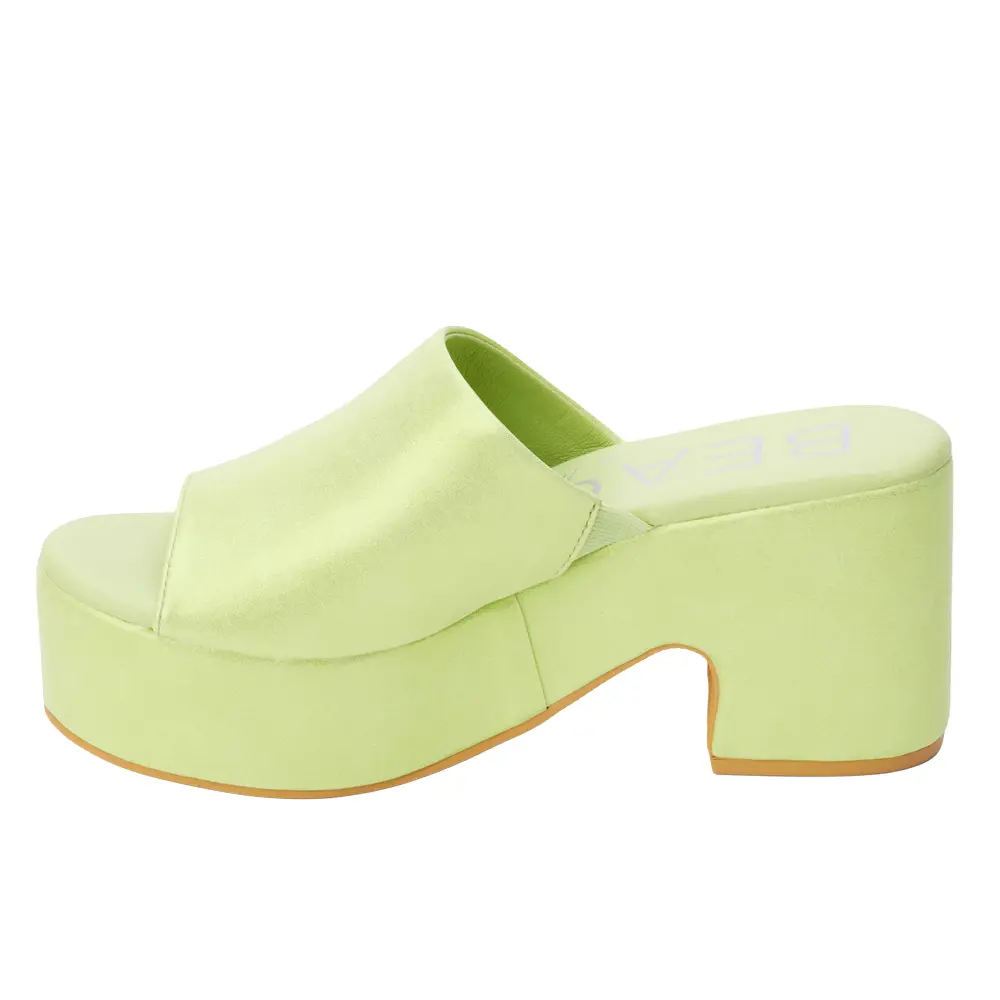 Vegan, chunky platform heel topped by a wide, single strap.