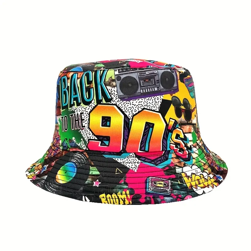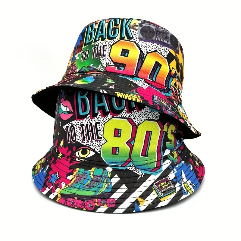 • Back to the 80s Design: A timeless style that never goes out of trend. • Colorful Patterned Hat: Brighten up your day with a playful design. • Versatile Use: Suitable for various occasions, from beach trips to casual outings.