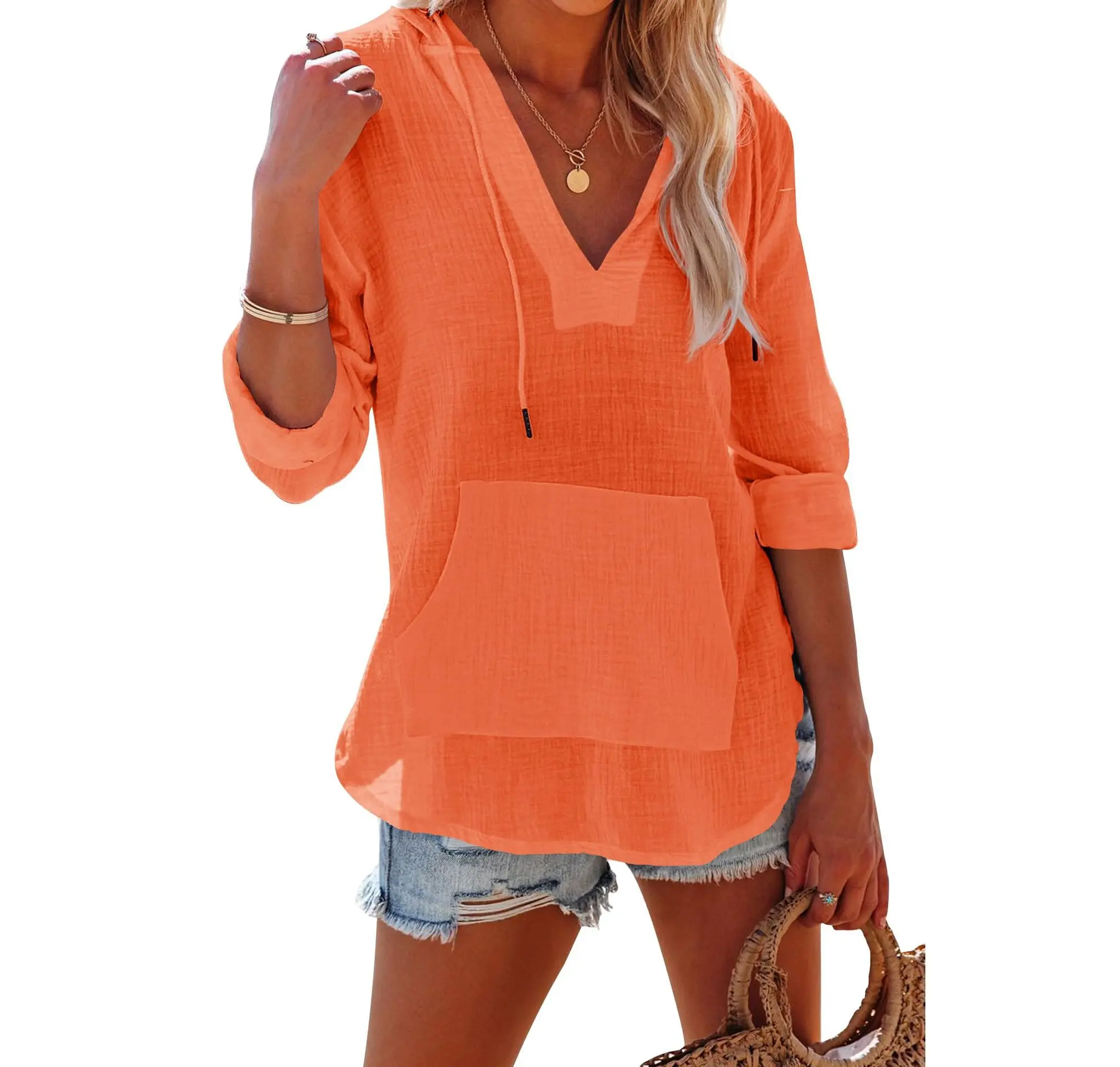 ·Features: Tunic beach shirts for women, long sleeves, side slit, kangaroo pocket, sexy v neck, hooded with drawstring tie, casual and relaxed fit style.