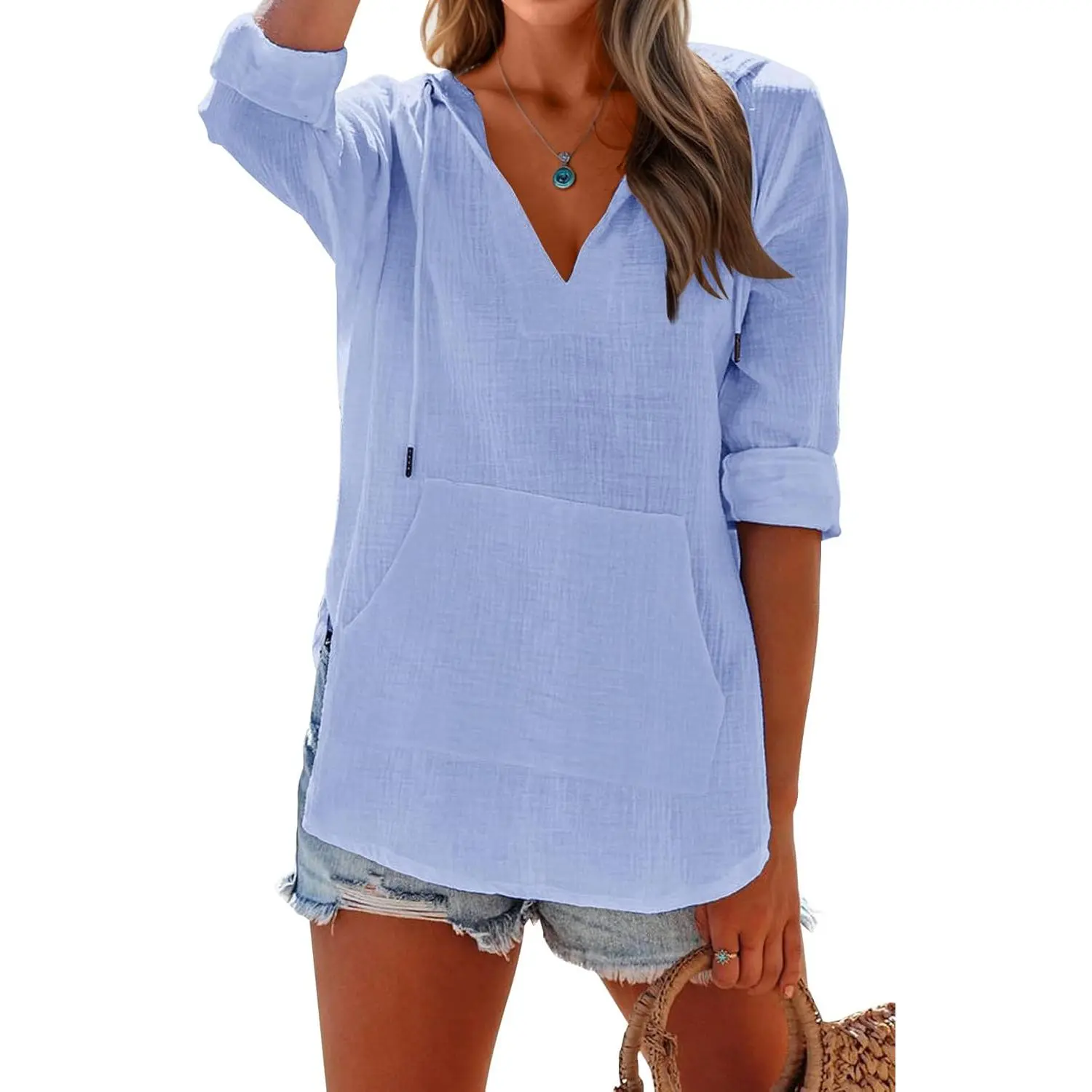 Ladies Summer Sexy V Neck Tunic Beach Shirts with Kangaroo Pocket