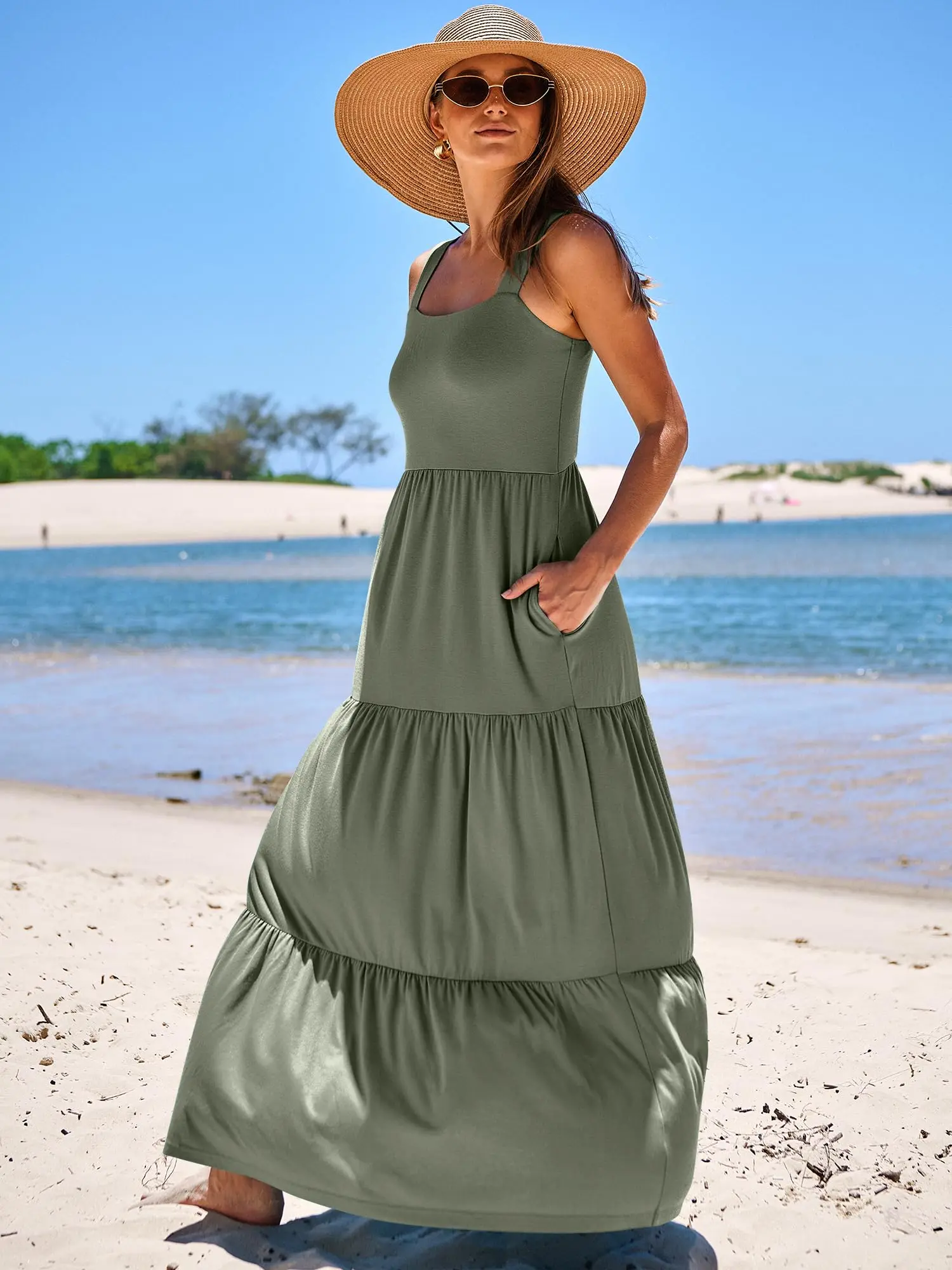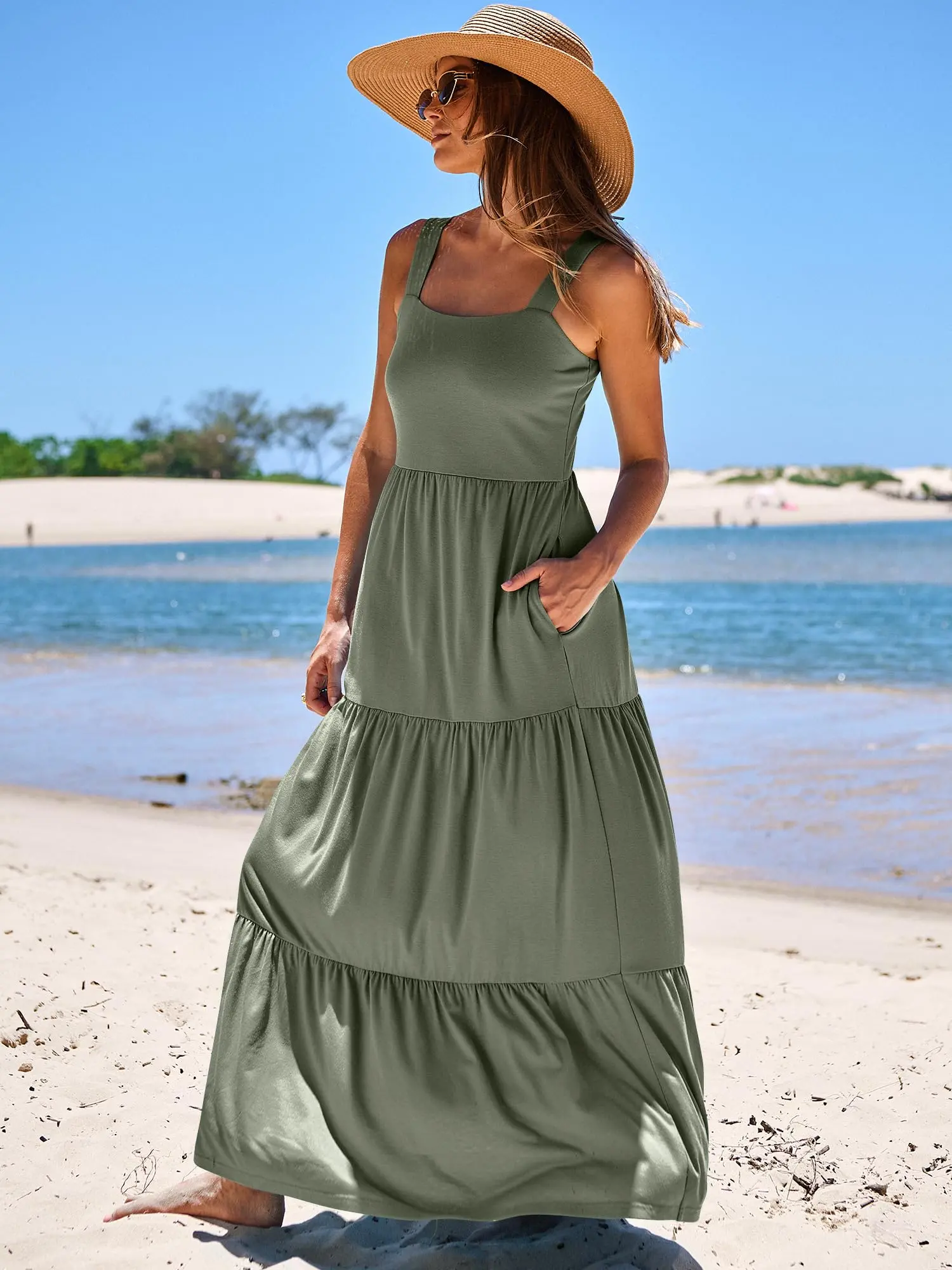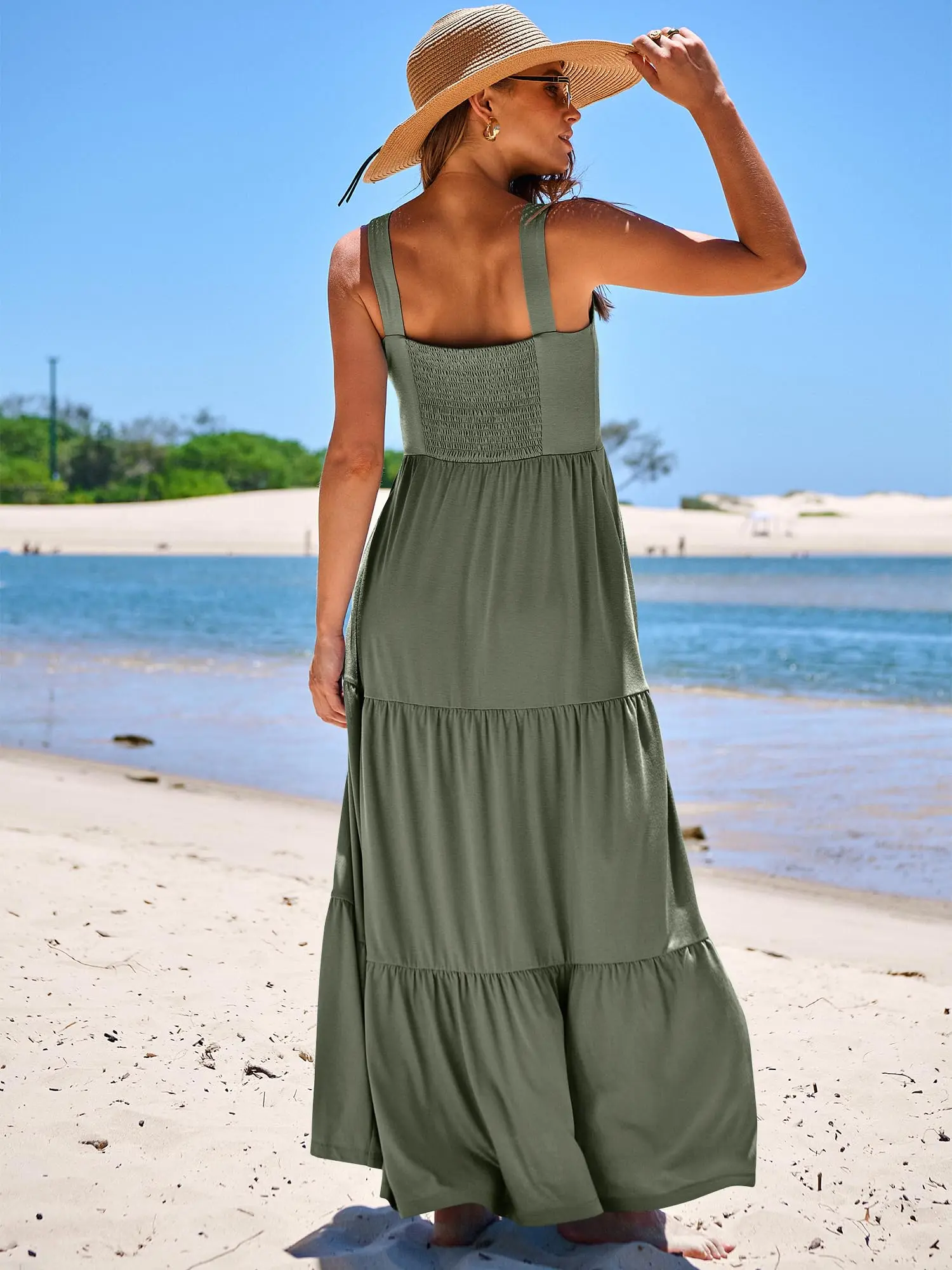 ·Features - Spaghetti strap, square neck dress, maxi length, backless, smocked back, two side pockets,relaxed fit, A-line pleated sundress, basic but cute long beach dresses
