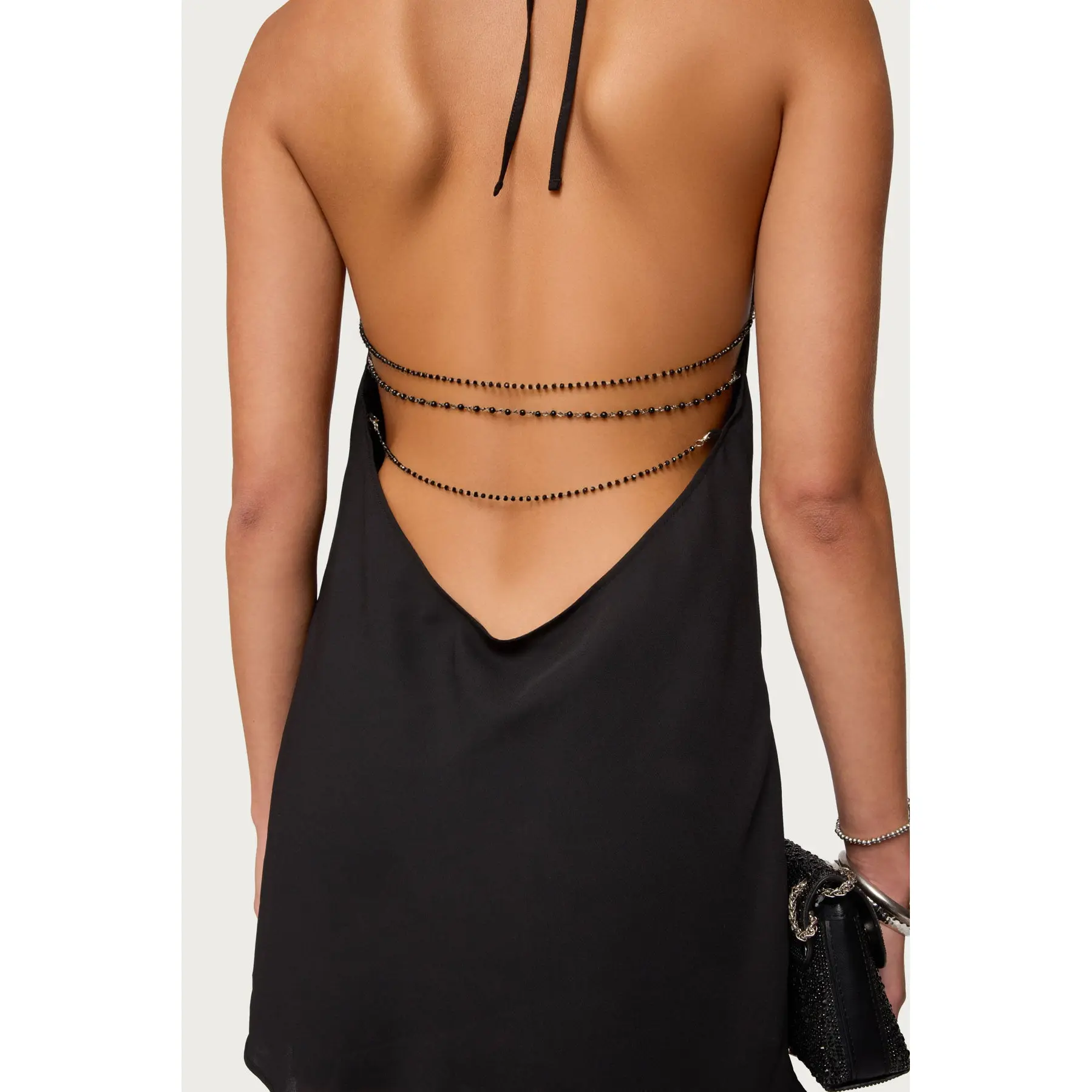 Bead Backless Cowl Neck Mini Dress