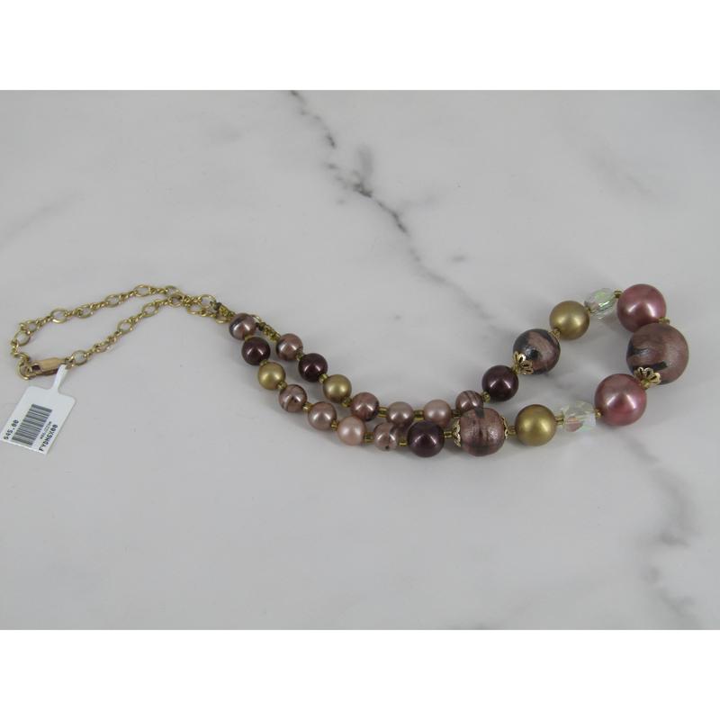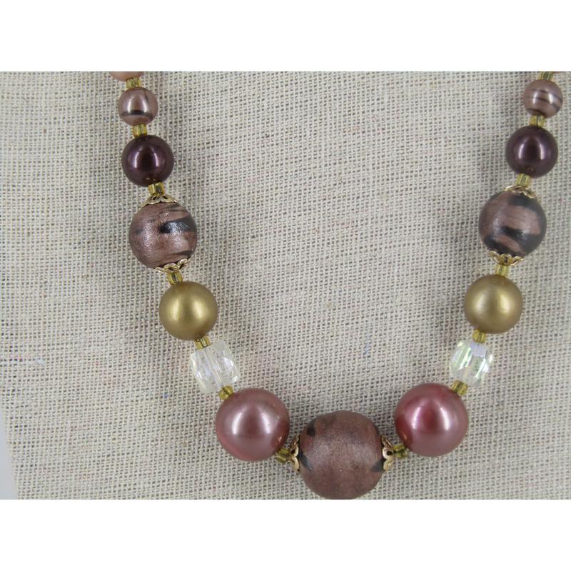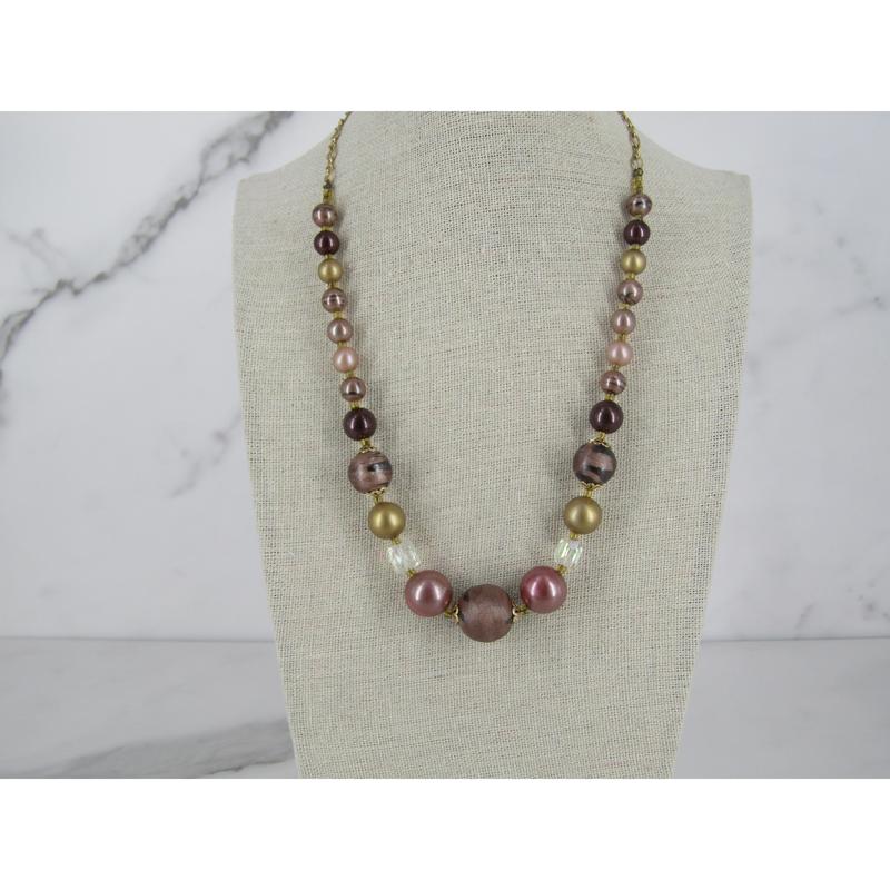 Base Metal vintage necklace with satin and lust round beads with faceted, clear plastic beads and gold colored infinity chain with lobster clasp.