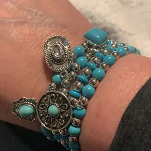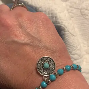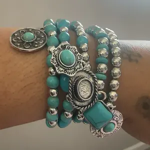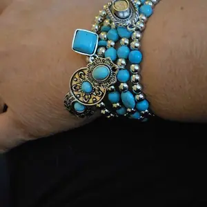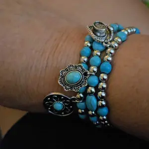 Really cute dangle faux turquoise bracelet that you can wear all together or individually. Goes good with just about everything. Super cute.