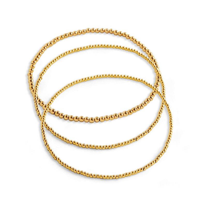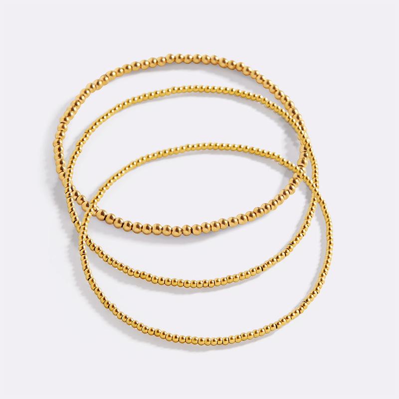 This set includes three elegantly simple bracelets: one featuring 3mm beads and two with 2mm beads. Each bracelet offers a subtle difference in scale, adding depth and texture to your accessory ensemble. Crafted to be versatile, these bracelets can be worn together for a unified look or mixed with other pieces to create a unique, personalized style. Perfect for everyday wear or as a thoughtful gift, this stacking set brings a touch of sophistication and charm to any outfit.