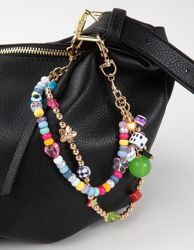 Full Tilt Beaded Chain Bag Charm. This colorful bag charm features 2 beaded chains with multiple charms, including a star shape, balls, dice, hearts, flowers and more. Multiple clasp closures to easily attach to your favorite bag. Not intended for children 12 and under. Imported. CALIFORNIA PROPOSITION 65 WARNING: This product can expose you to chemicals, including lead which is known to the State of California to cause cancer or birth defects or other reproductive harm. For more information go to www.P65Warnings.ca.gov.
