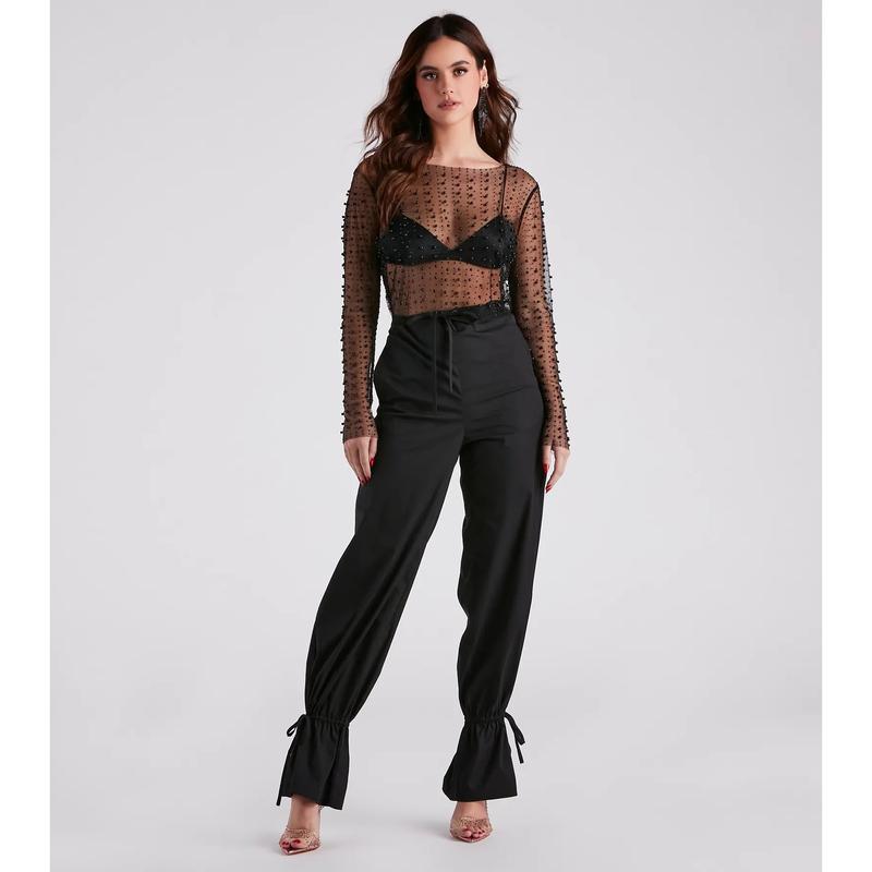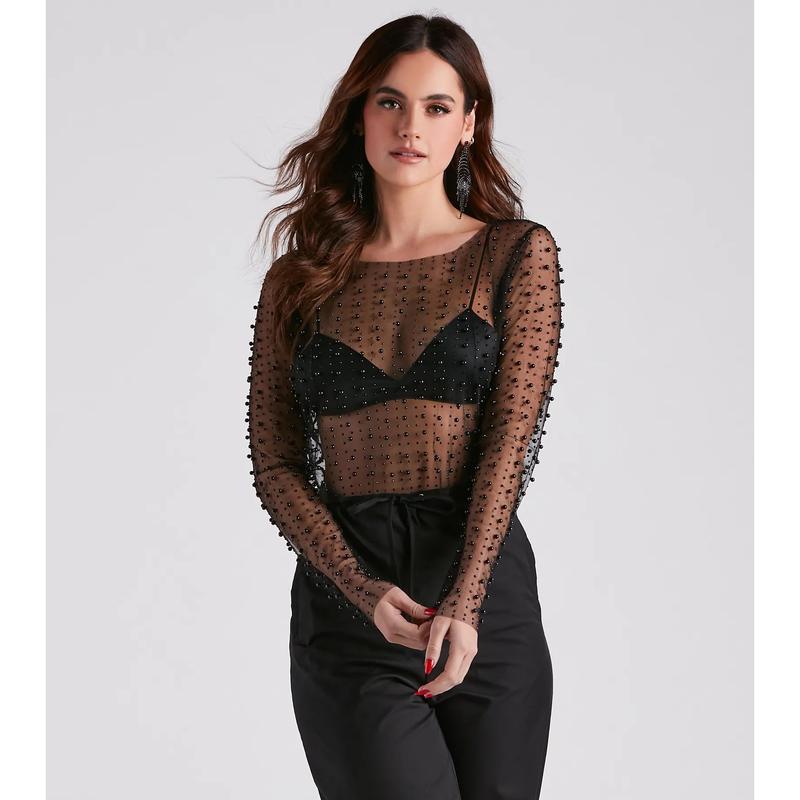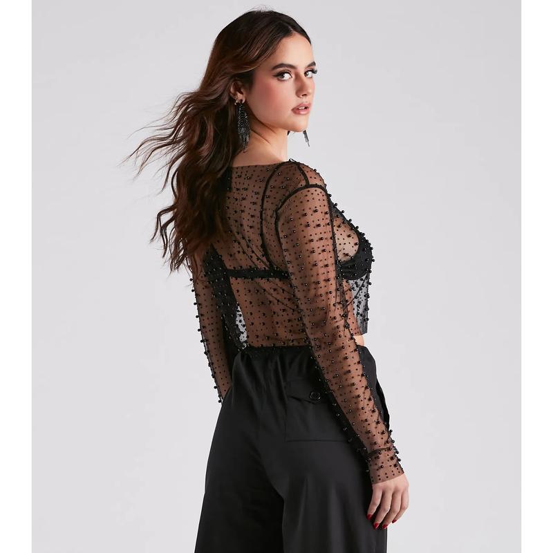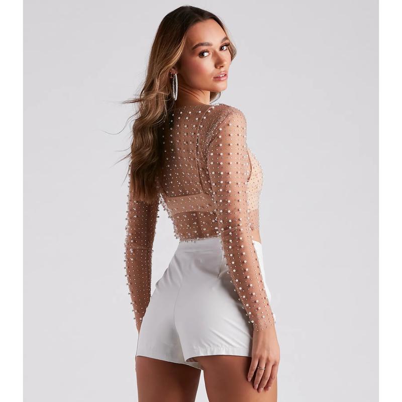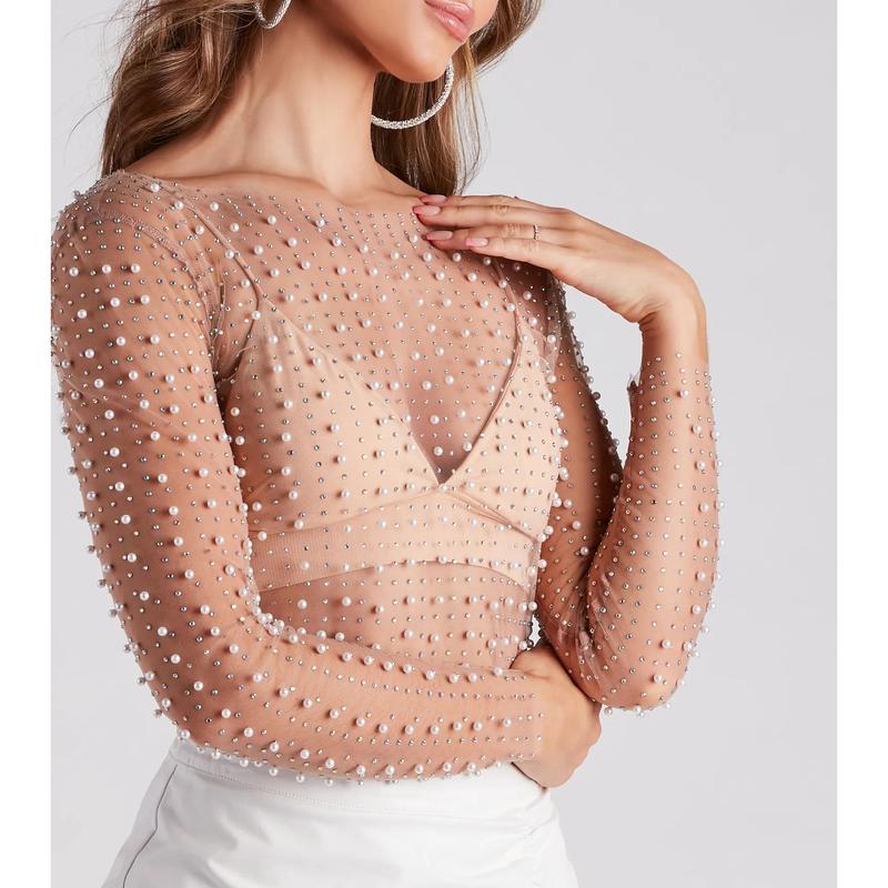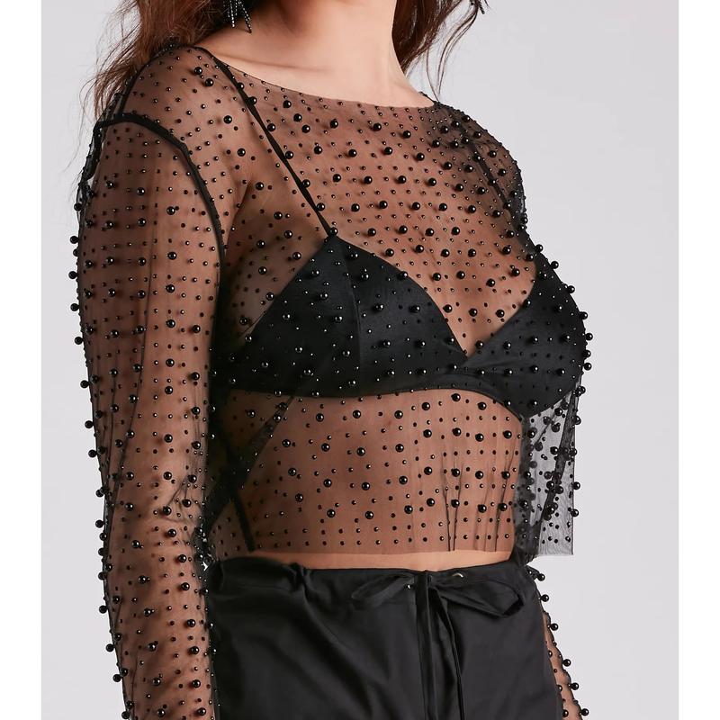 Dazzle in this sheer long-sleeve crop top, designed for layering over your go-to bralette. The beaded mesh fabric infuses any look with a sultry sparkle, ideal for pairing with denim or a mini-skirt. The crop top's luxurious faux pearl and crystal embellishments add a touch of elegance, making it a perfect match for high-rise fashion pieces. Finish your look with a simple camisole or an intricate lace bra for the ultimate chic ensemble.