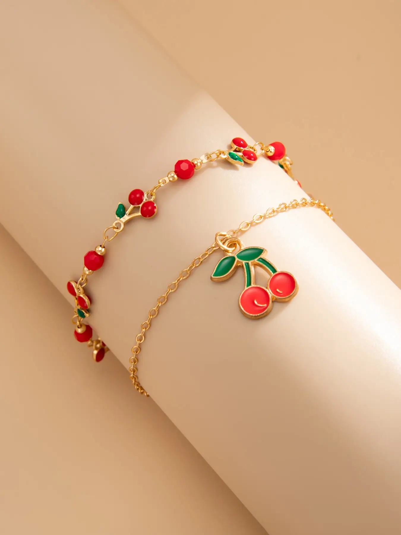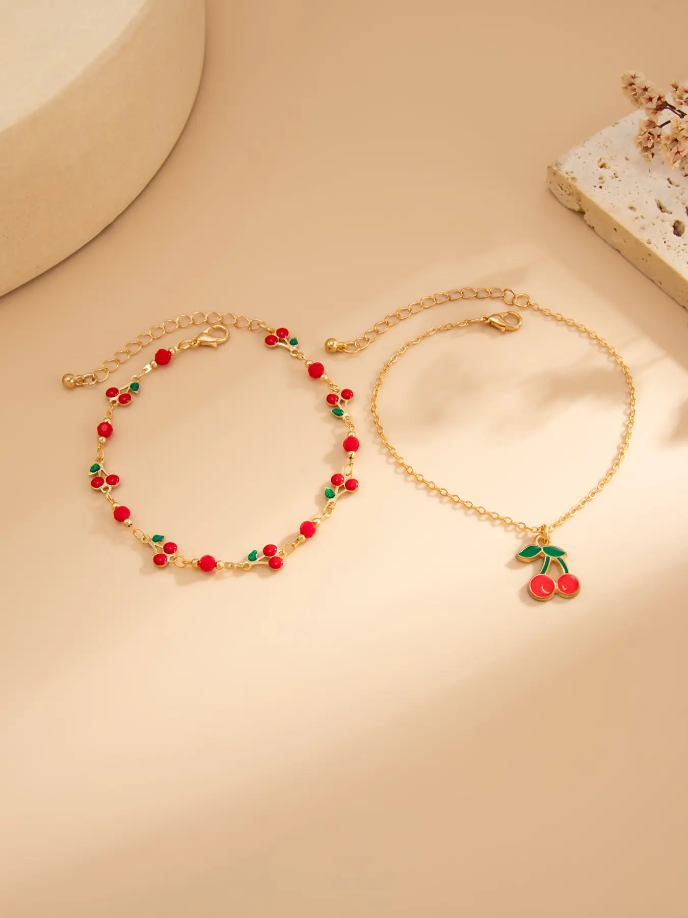 Beaded Multi-Layer Anklet Set, Cherry Design, Cute Style, Zinc Alloy Material, Spring Summer Fashion Accessory