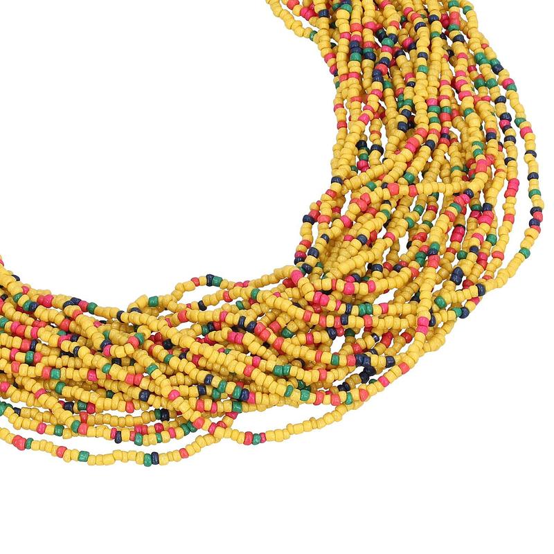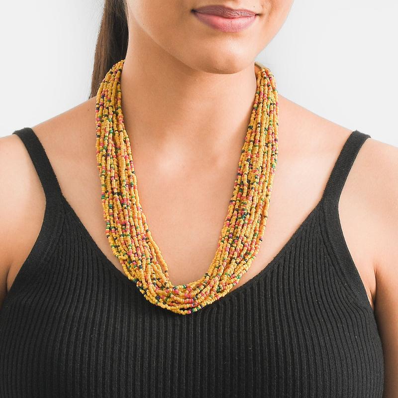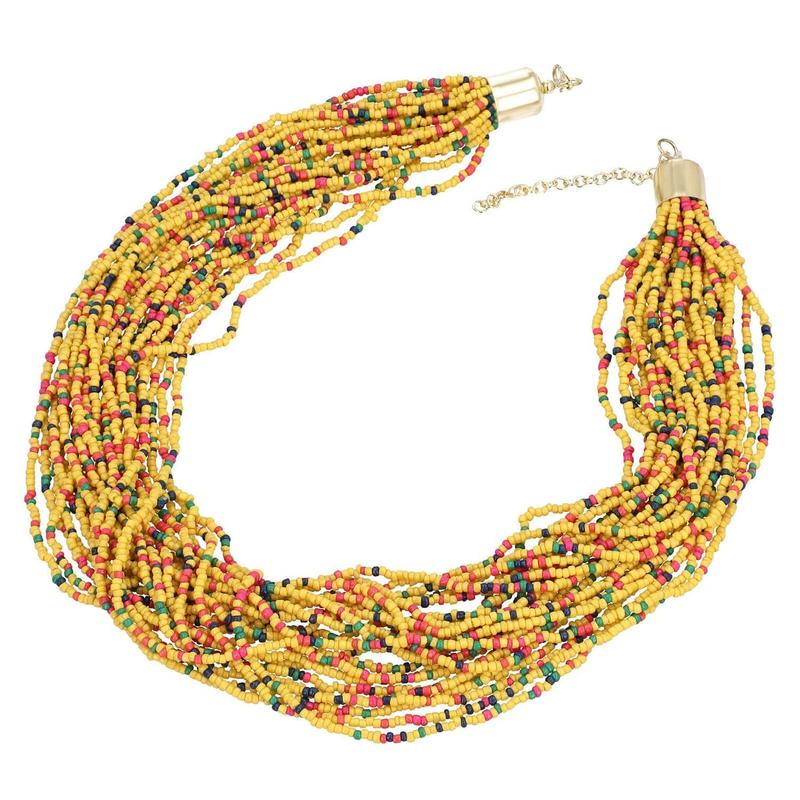 An epitome of elegant layered jewelry, this exotic colored seed beaded multi layered necklace is a true jewel of enchantment. Multi strands of drilled seed beads adornment add a dramatic effect to the piece. The lustrous finish offered to each seed bead by buffing it to perfection renders the jewelry an excellent look. Seed beads or rocailles are uniformly shaped, spheroidal beads ranging in size from under a millimeter to several millimeters. This seed beaded necklace is a treat for the ones looking to make an eccentric fashion statement. Filled with glamour and mystic charm, this matinee length necklace can be paired with any formal or casual ensemble.