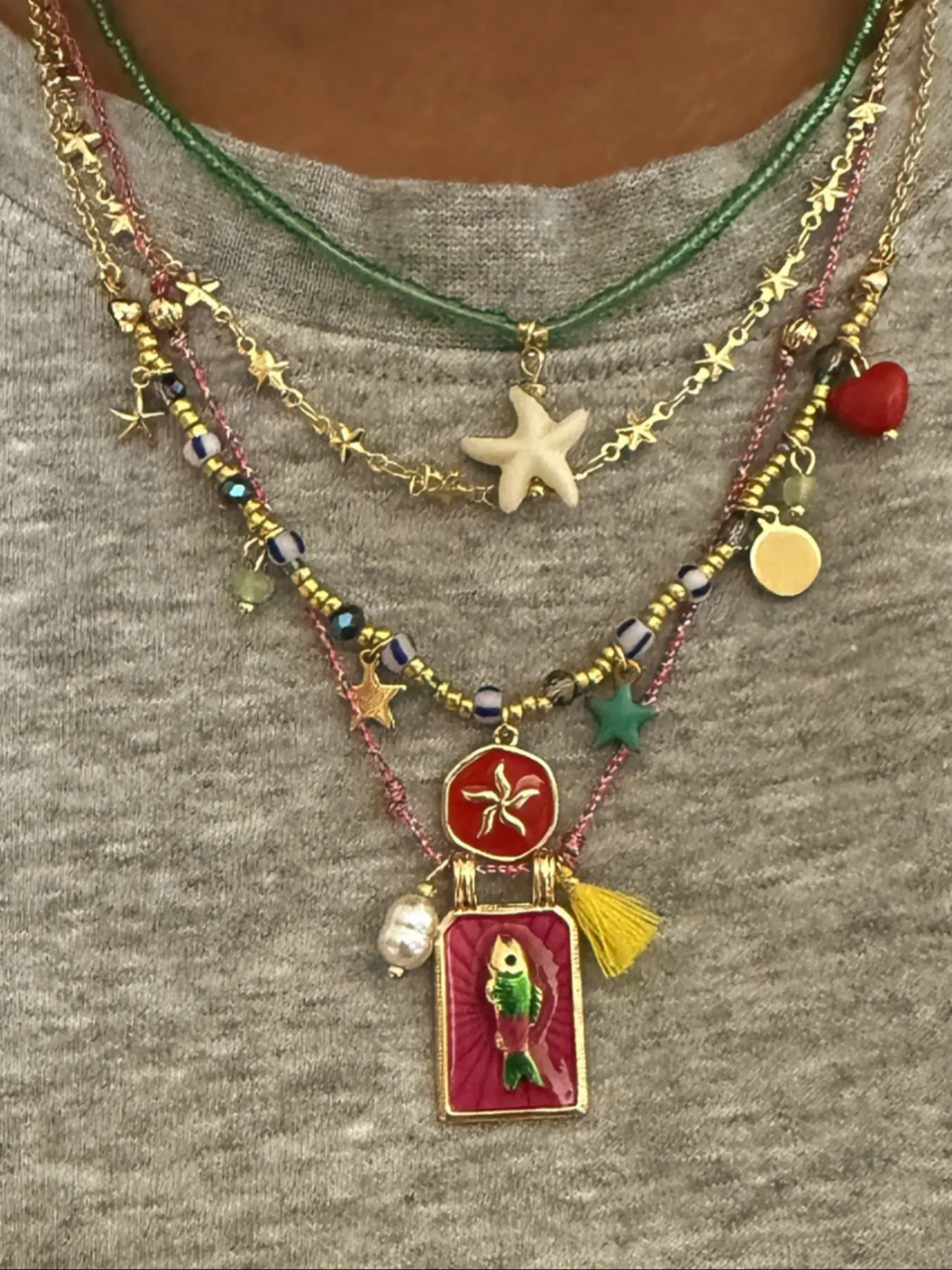 Love these necklaces. I wear them separate or a couple together. I haven’t worn them all together yet. Quality is great.
