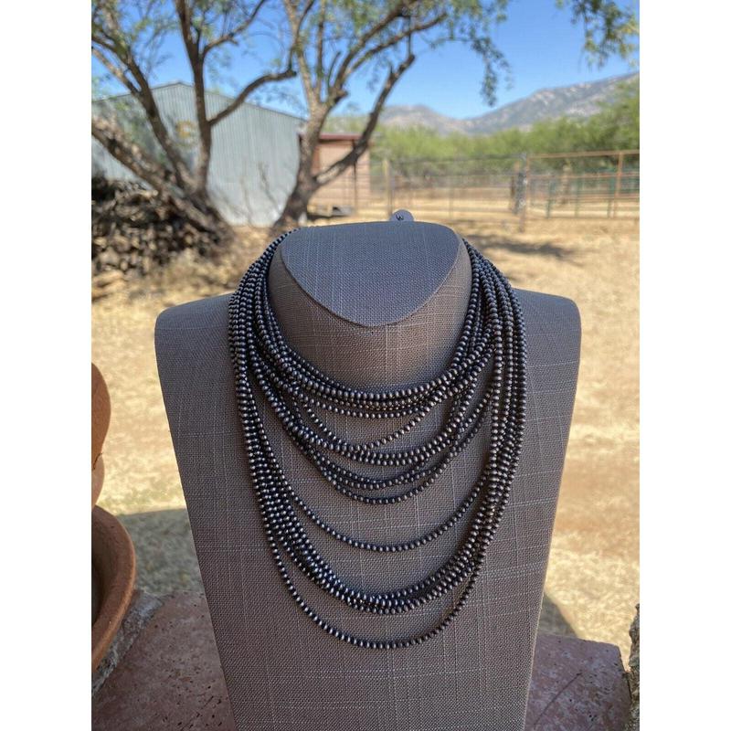 These are 3mm Sterling Silver Navajo Style Pearls with a hook clasp, Great for laying with your favorite beads! Beads are strung by a Navajo artist. LISTING IS FOR ONE STRAND, MULTIPLES SHOWN FOR DISPLAY.