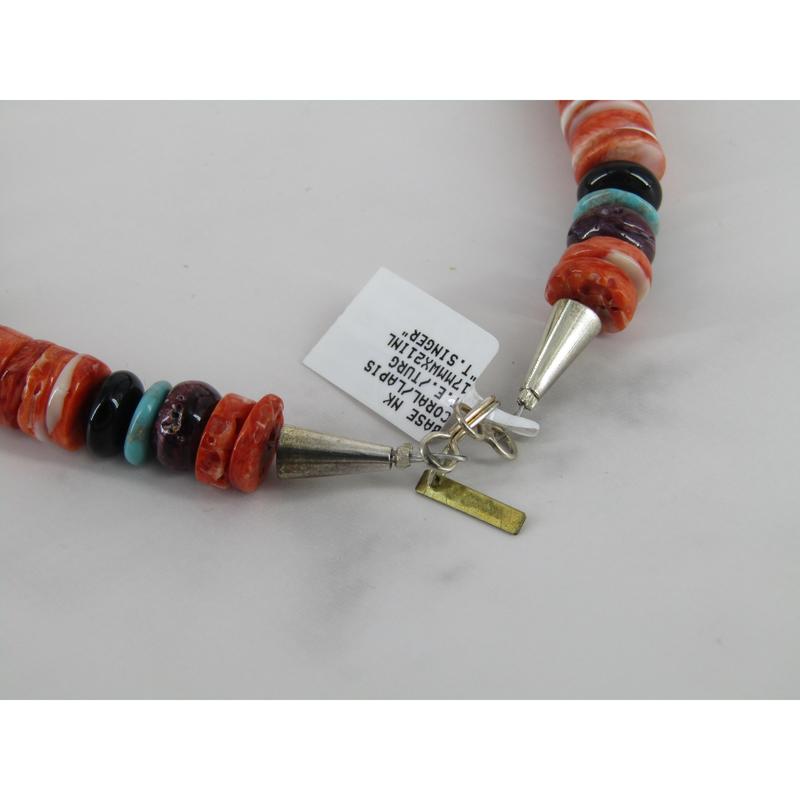 Metal: Base Gem: Coral shell Accents: Tigers eye, turquoise, lapis Width of Chain: 17 mm Length of Chain: 21 Inches Marks: “T.Singer” Stamped on metal tag