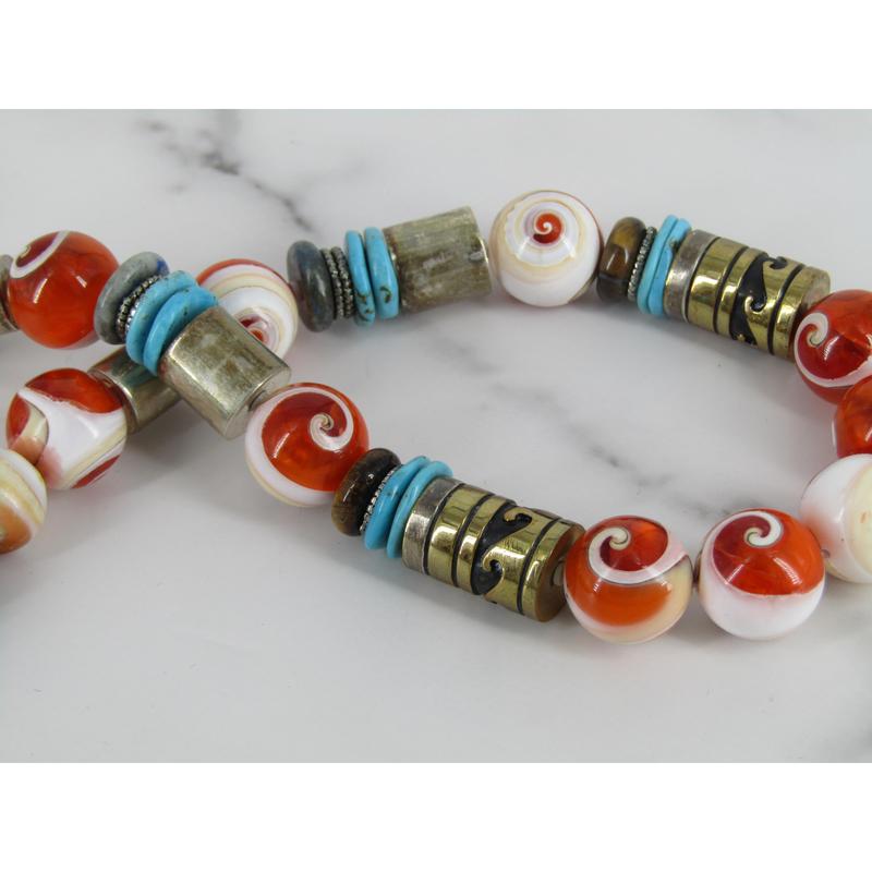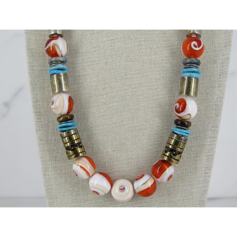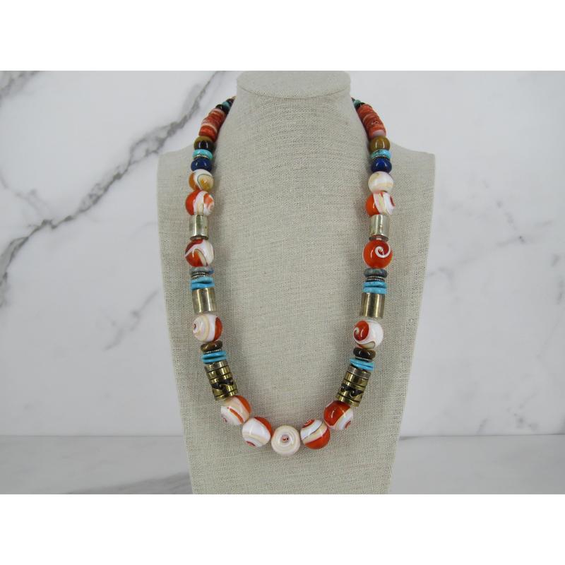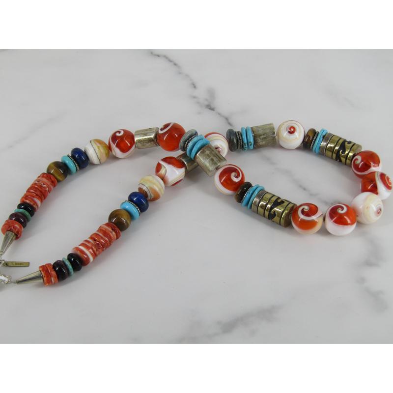 Base metal necklace with various beads. Beads are made of coral shell, tigers eye, turquoise, and lapis.
