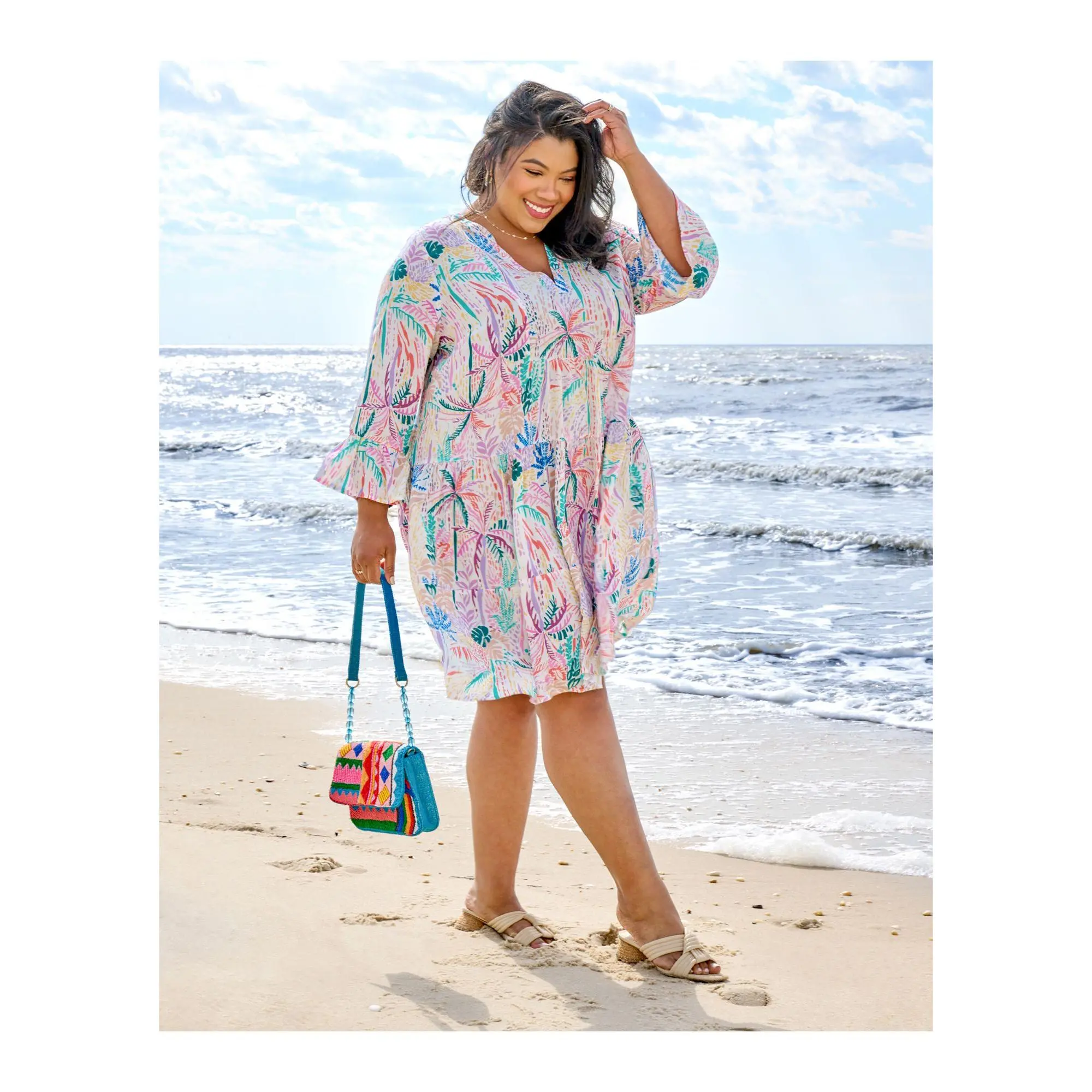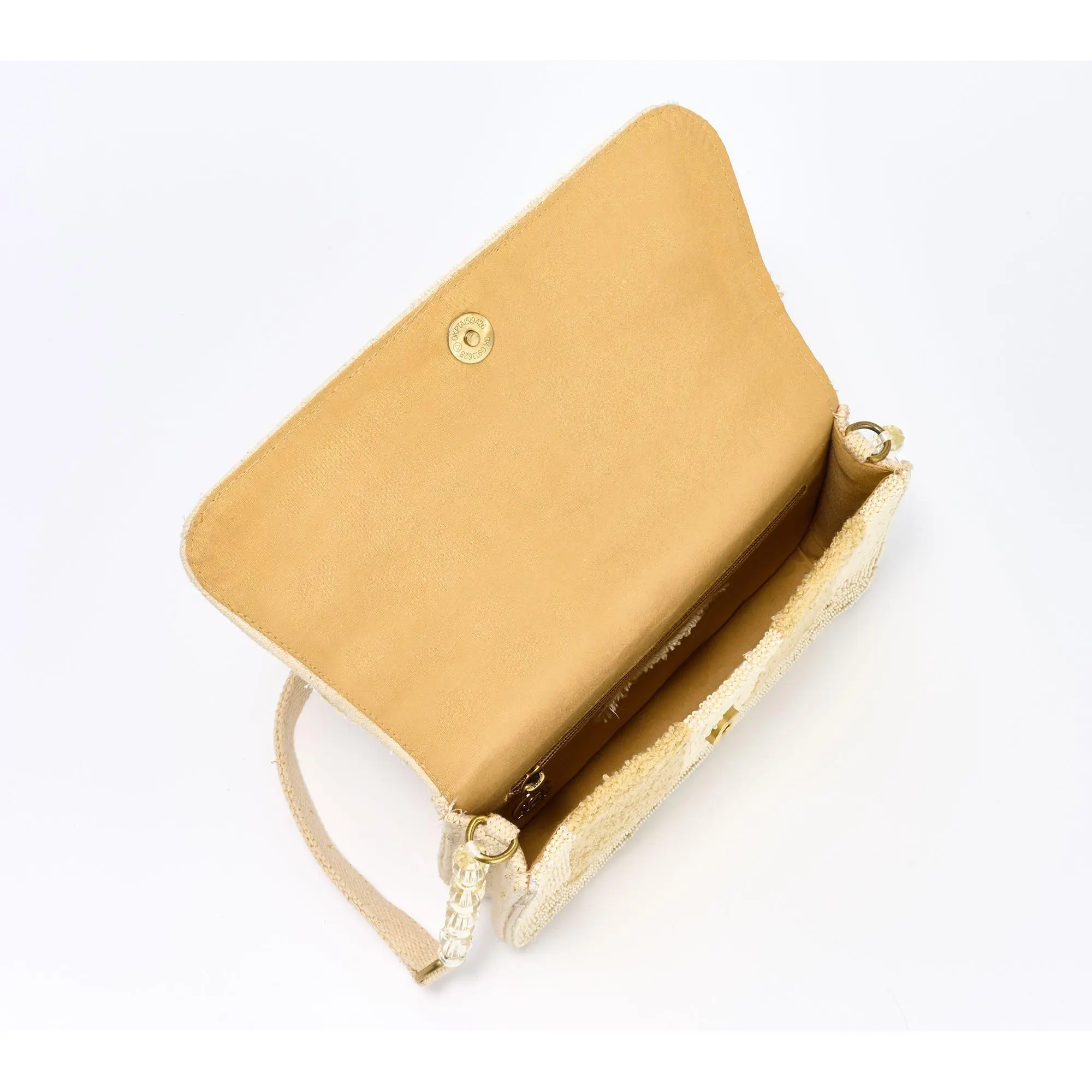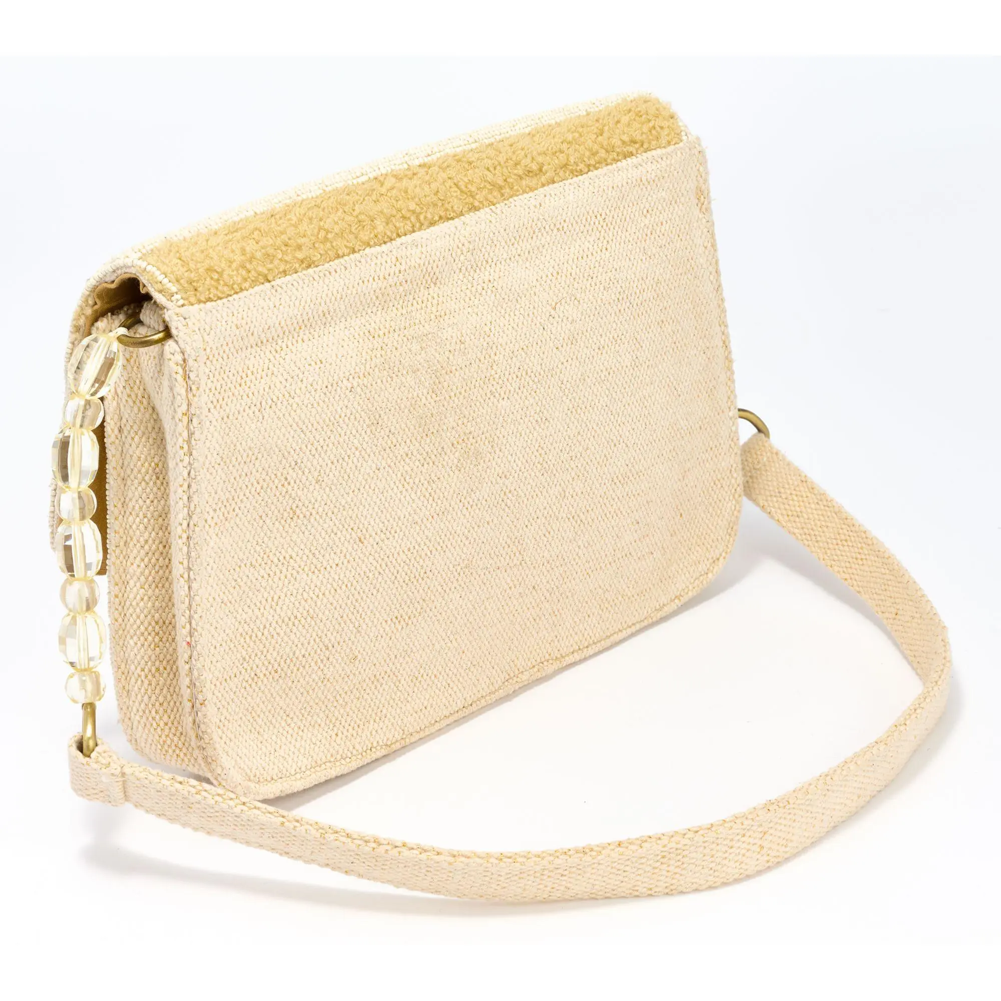 ·Flap front closure with magnetic snap, beaded strap with coordinating soft shoulder panel