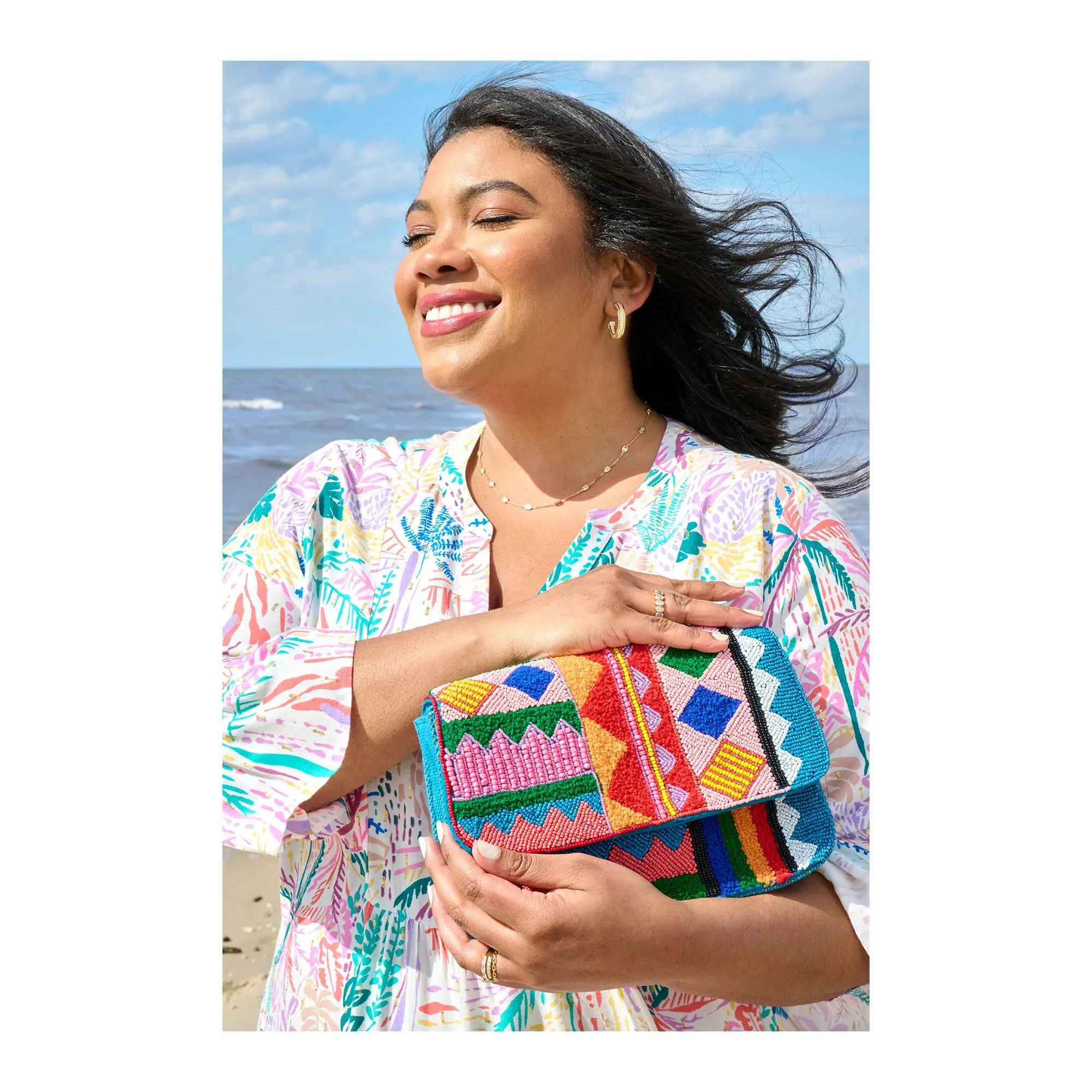factor. A hand-beaded flap front closure adds visual appeal, while a beaded strap and coordinating shoulder panel complete the look. Fall in love with the luxe vibe of this must-have accessory. From America & Beyond.