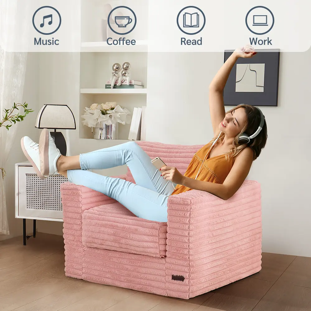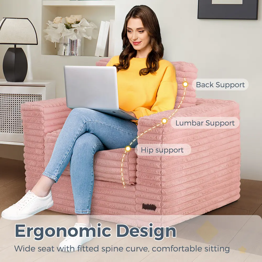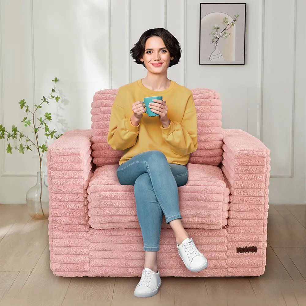 The chair is packed with supportive, high-density base foam and designed with sponge partitions for enhanced comfort and durability. The pillows are filled with shredded foam, combining softness and resilience so the chair keeps its shape while feeling luxuriously cozy.