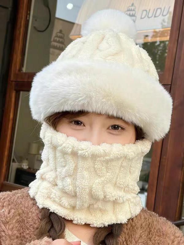 Solid Color Pom Pom Decor Crochet Beanie Hat, Unisex Casual Warm Thickened Face Mask Hat for Fall & Winter, Fashion Accessories for Women & Men