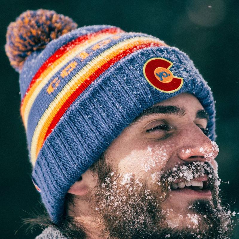 A super soft, heavyweight acrylic beanie with a multi-colored pom and fold-out cuff to keep your noggin toasty on those crispy cool Colorado nights!