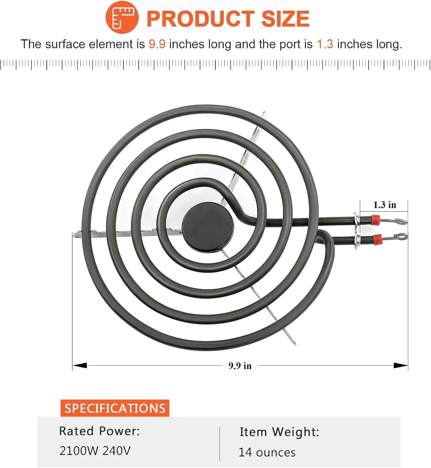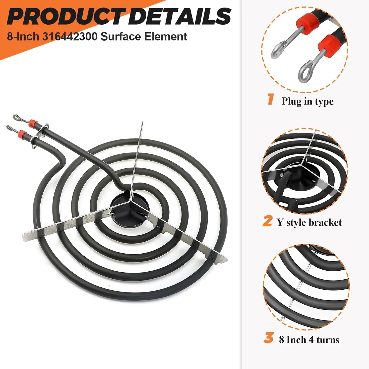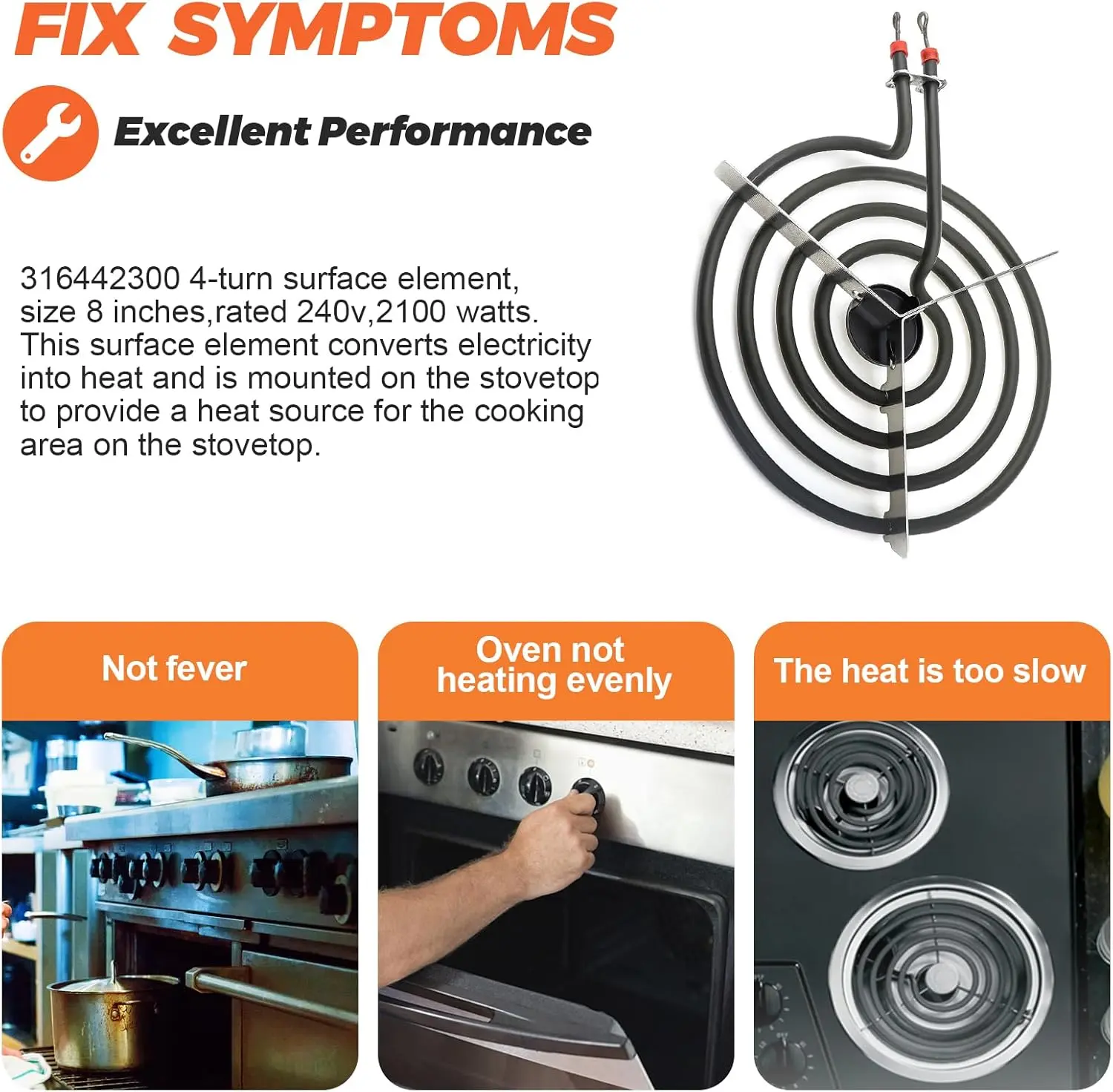 ·✔✔【8 INCH BURNER ELEMENT SURFACE】: Includes 1 x 316442300 8 inches surface element, it converts electricity into heat, mounts on the stovetop and provides a heat source for the cooking area on the stovetop.The range element replacement is a coil burner that has looped terminal ends to plug into the stove.The 316442300 surface element with 4 turns, size is 8 inches, rated power 240v, 2100 watts