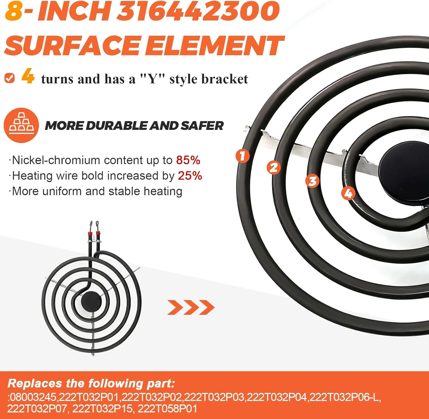 ·✔✔【HIGH COMPATIBILITY】:316442300 8 "surface element can replace Ken-more, Cro-sley, Frigid-aire, and Kelvi-nator burners.Replace 08003245, 222T032P01, 222T032P02, 222T032P03, 222T032P04, 222T032P05, 222T032P06, 222T032P06-L, 222T032P07, 222T032P15, 222T058P01, 222T061P01, 1465860, AP4356466, PS2339241, EAP2339241