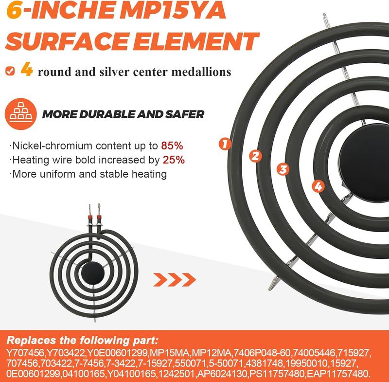 ·【𝙈𝙋𝟮𝟮𝙔𝘼 𝙀𝙡𝙚𝙘𝙩𝙧𝙞𝙘 𝙍𝙖𝙣𝙜𝙚 𝘽𝙪𝙧𝙣𝙚𝙧 𝙀𝙡𝙚𝙢𝙚𝙣𝙩 𝙆𝙞𝙩】--- Includes 2 × MP15YA 6" 4 coils Stove Burner Element 1500 watt 230v, 2 × MP21YA 8" 5 coils Stove Burner Element 2100 watt. The multiple turns of the coil can provide higher cooking performance, resulting in better heating performance, and you can better enjoy the fun of cooking.TIPS:☞MP22YA Electric Range Burner Surface Element have a "Y" bracket. This burner element is not suitable for GE and Hotpoint, please make sure your Y-bracket size is the same as ours, otherwise the product may not fit your drip pan