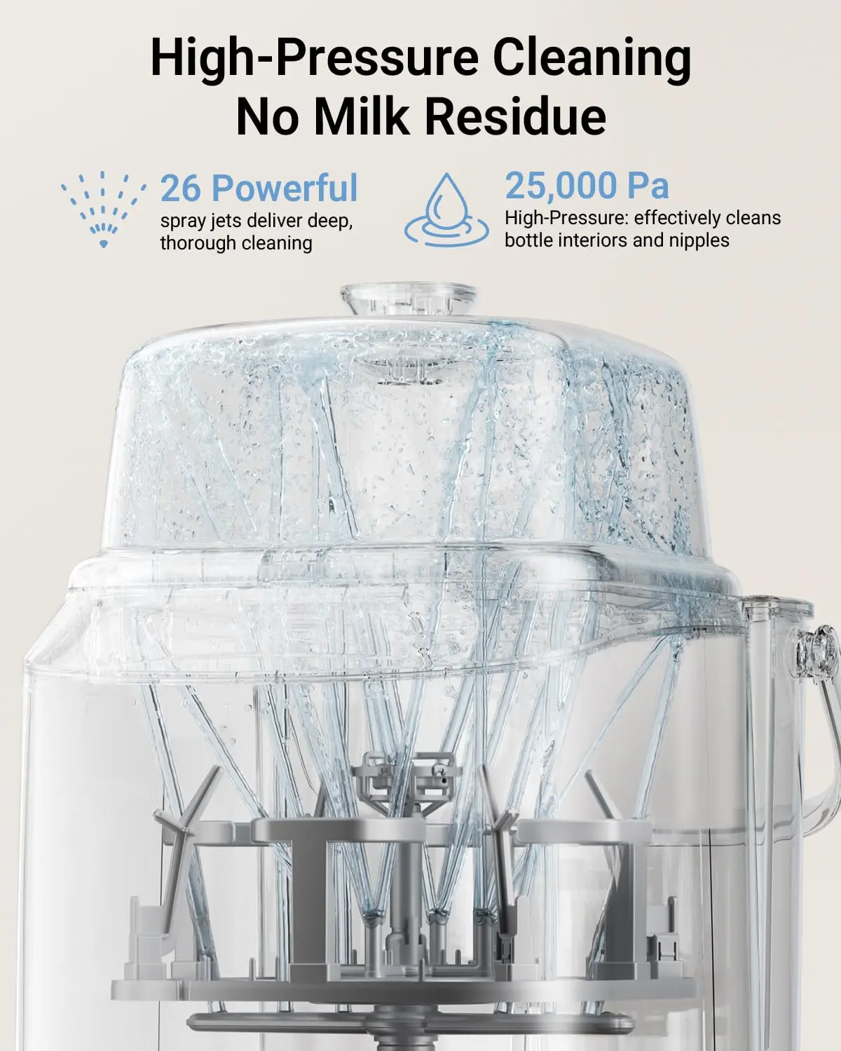 ·26 POWERFUL SPRAY JETS FOR FLAWLESS 360° CLEANING: With 12 precise interior spray jets and 14 swirling exterior jets, Bear’s high-pressure spray system (25,000 Pa) ensures deep cleaning of bottles, pump parts, and accessories—removing even stubborn milk residue. Uses 94.7% less water than manual washing