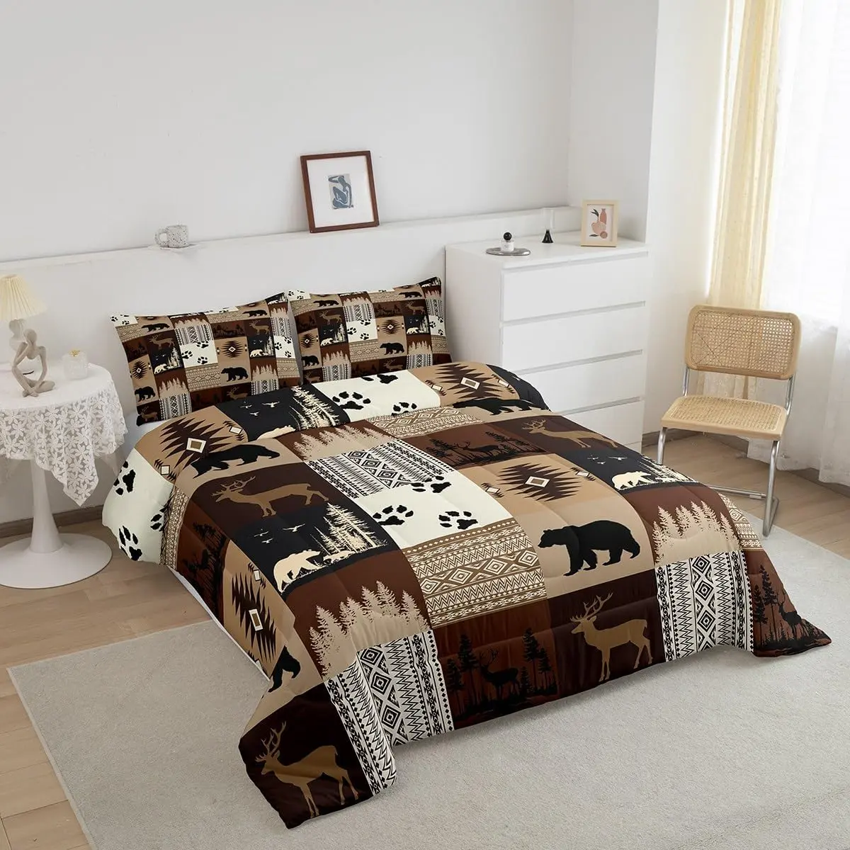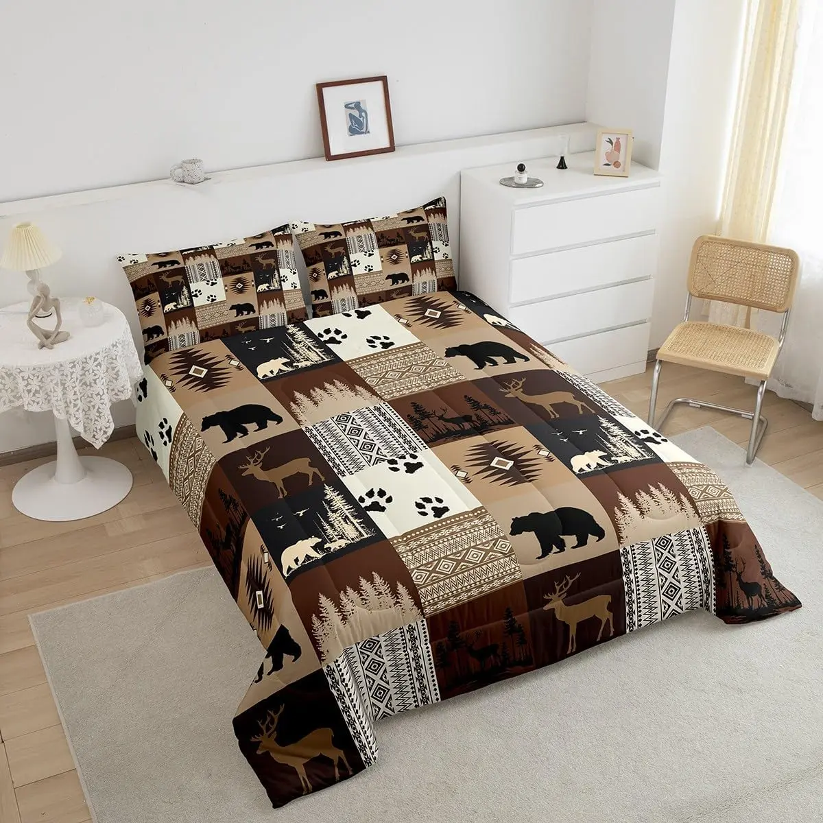We use digital printing technology to create exquisite designs for our comforters. Whether you're looking for modern geometric shapes, sports themes, western themes, or animal-inspired designs, you will find a unique bedding set here. The Bear Comforter Set and Deer Comforter feature rustic bear bedding and deer hunting southwestern plaid grid brown duvet set.