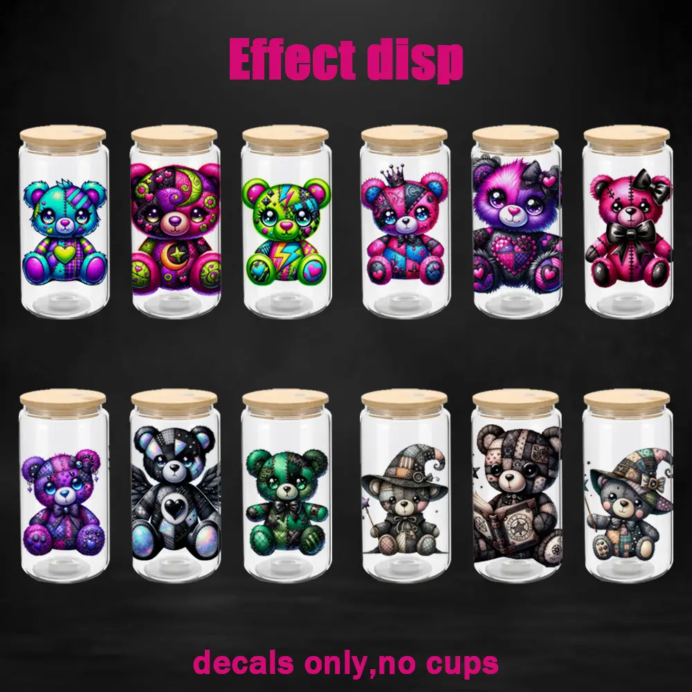 8-Piece Set, 4 Designs X 2 Pieces, 16 Oz UV DTF Crafts Cup Stickers, Bear Pattern 3D Decals, Durable Mixed Color Transfer Material