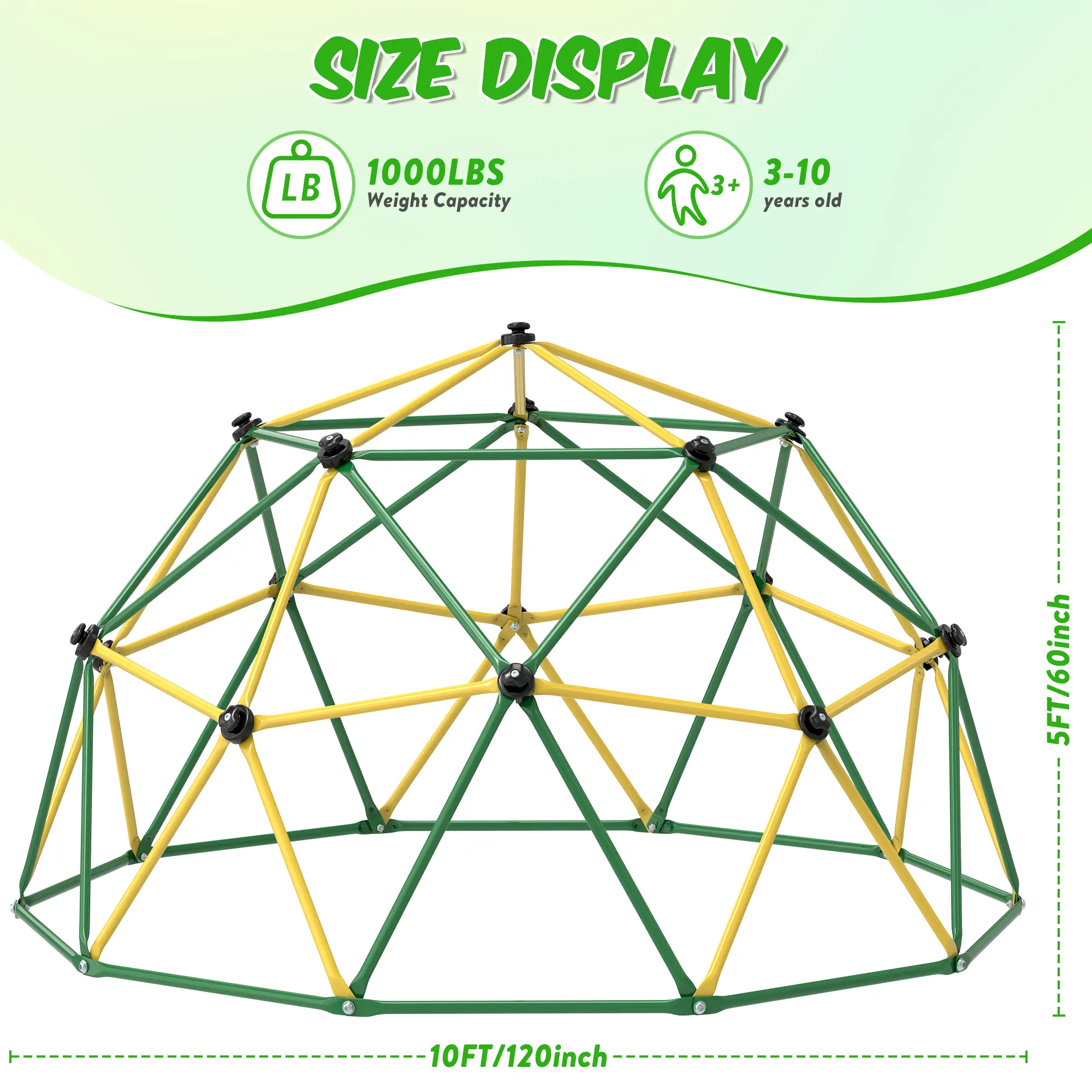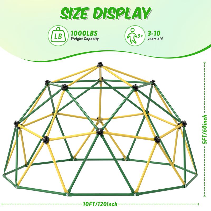 ·Sturdy Design - The whole frame is composed of 65 hot-dip galvanized pipes with a 25.5mm thick iron wall, It's sure to stand the test of time. Diameter 10ft, height 5ft, weight-bearing 1000lbs, suitable for kids 3-10. The climbing frame allows up to 6 children to play synchronously.