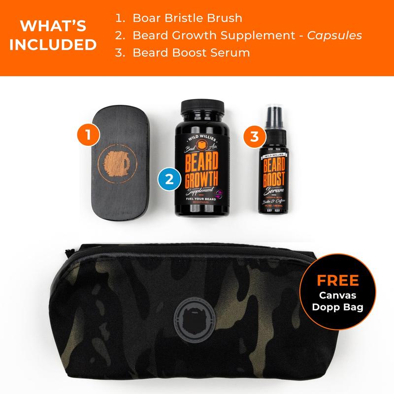 ·Wild Willies Beard Growth Kit: Let’s cut to the chase — this is the kit you need for beard growth. Includes Beard Boost Growth Serum, Beard Growth Supplement, boar bristle brush, and travel bag.