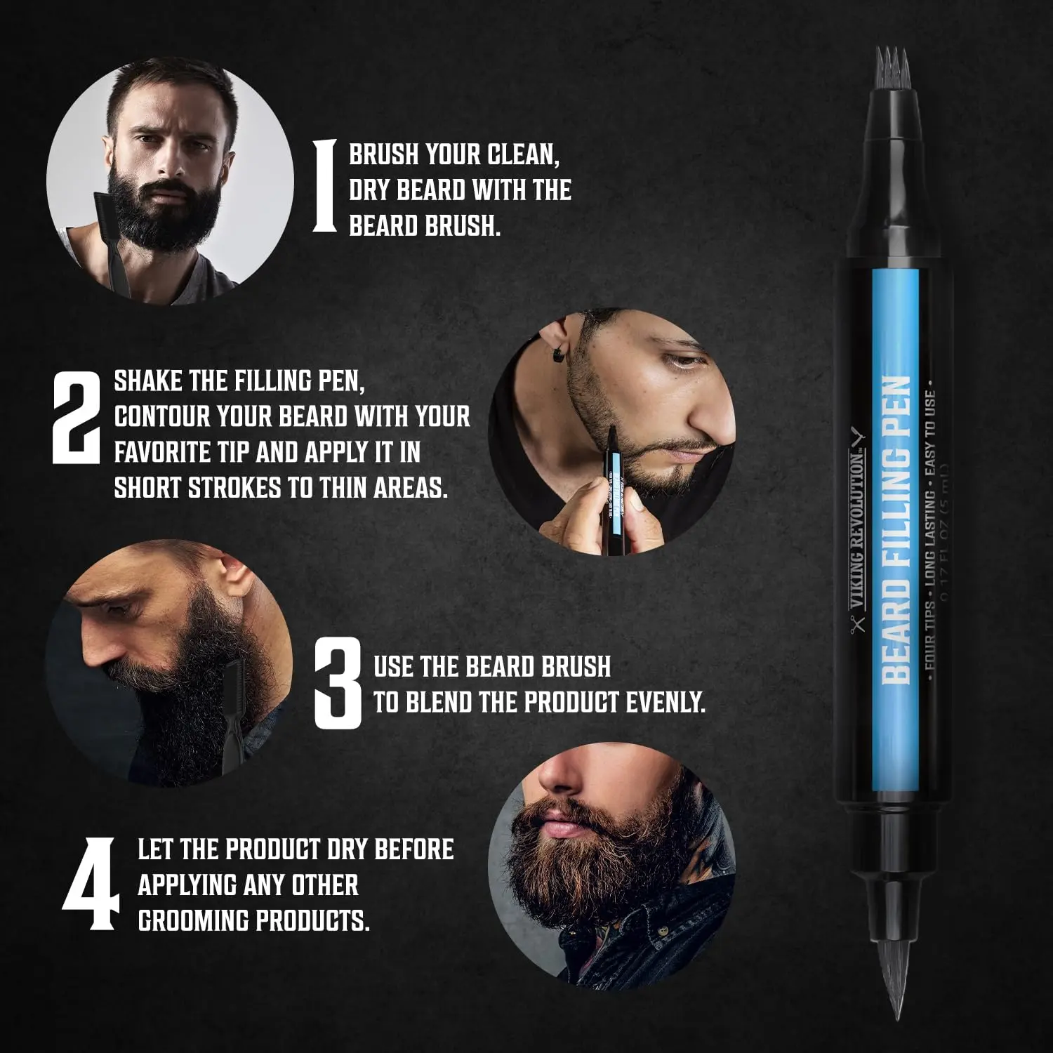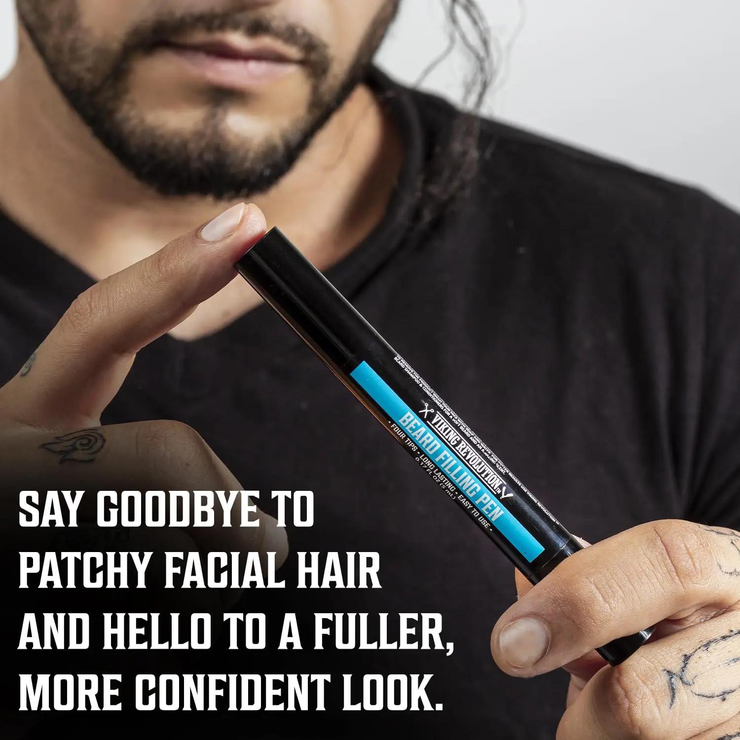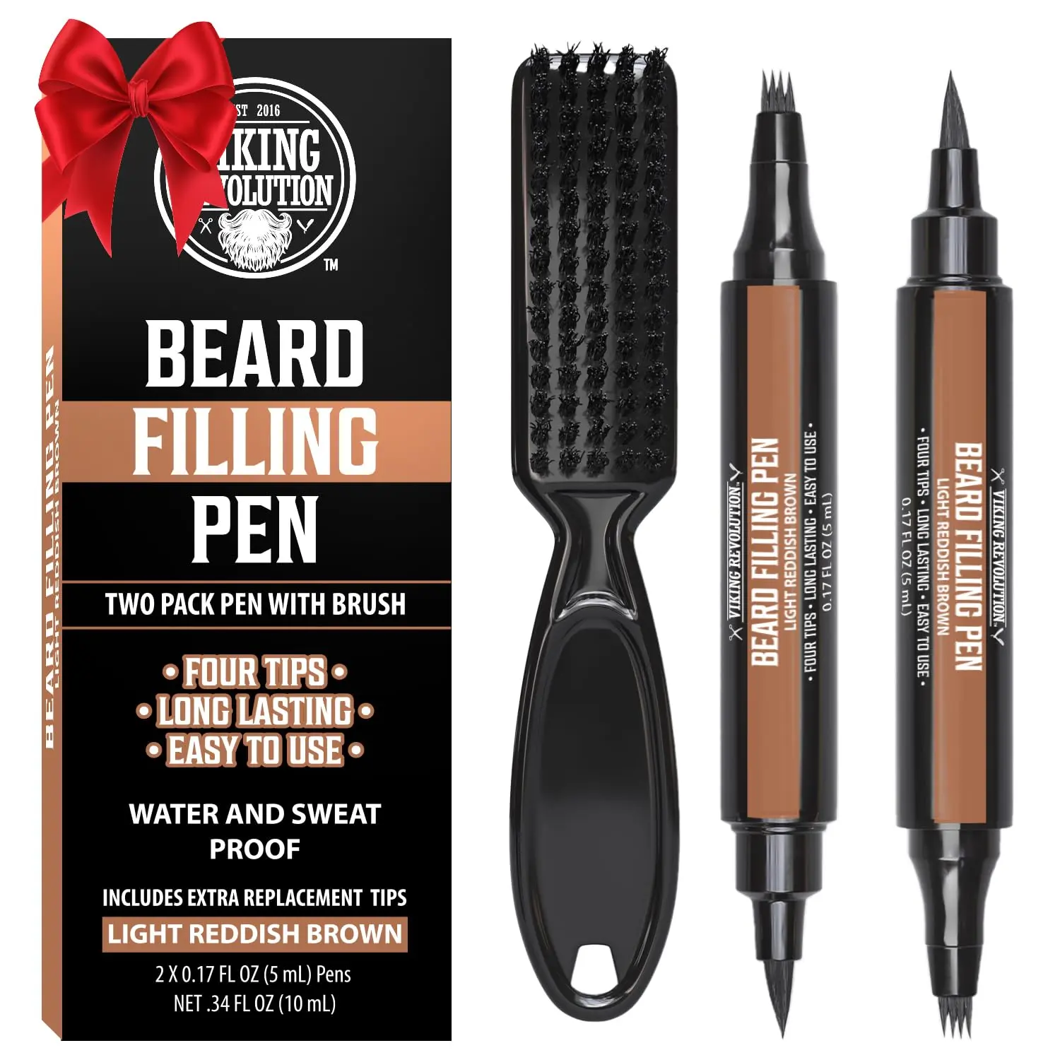 Viking Revolution Beard Filling Pen 2-Pack with Brush ensures a fuller, natural look. No more patchy beards. Achieve a fuller, more even beard with our easy-to-use beard filler. Effortless grooming for all experience levels. Simply fill in patchy spots for a natural look. Stays put all day, even through workouts and sweat.