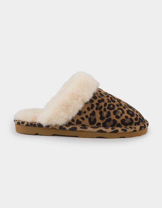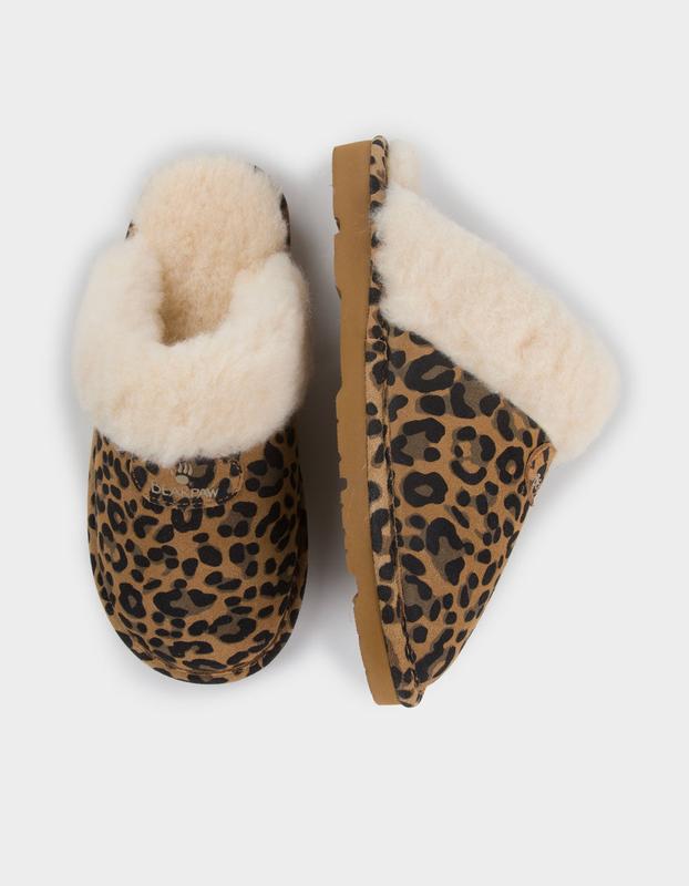 Bearpaw Loki Exotic Womens Slippers. Bearpaw's Loki slippers styled exotic in prints, sparkles and fun trims. These cozy slippers feature soft suede uppers with a wool or wool blend collar that is easy to maintain and offers the perfect blend of cute and comfy. Bearpaw's wool or wool blend lining regulates body temperature to keep your feet warm with a super soft footbed to reduce foot fatigue. Enjoy your lounge and live life comfortably! 100% Polyester faux fur. Blown rubber outsole. Imported.