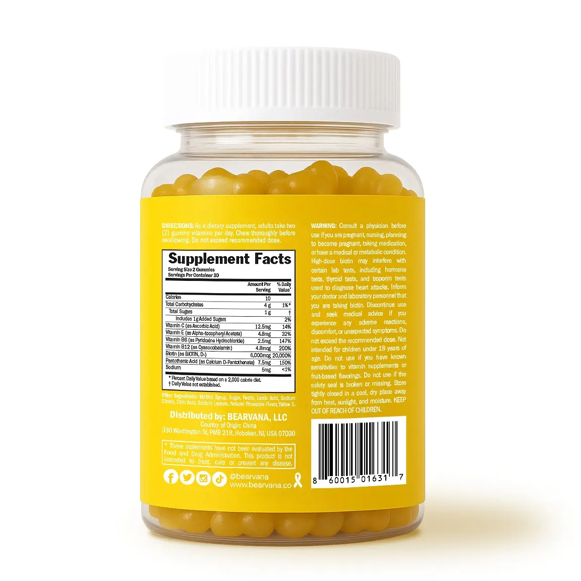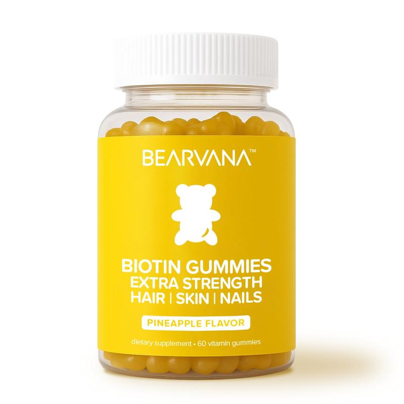 BEARVANA BIOTIN supports hair, skin, and nails with vitamins C, E, B6, and B12. This one-month supply (60 gummies) is a dietary supplement for hair support. Each gummy contains essential nutrients for overall well-being. Perfect for those seeking a convenient way to maintain healthy hair, skin, and nails.