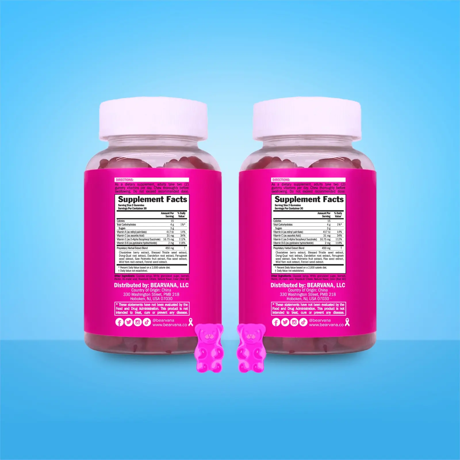 Made by BEARVANA with gluten-free and soy-free ingredients, these vegan-friendly supplements are suitable for all women. Each pack contains 120 gummies (60 per bottle) with a total net weight of 0.94 pounds per double pack and volume of 250 CC (per bottle) making it easy to carry around during travel or your work commute.