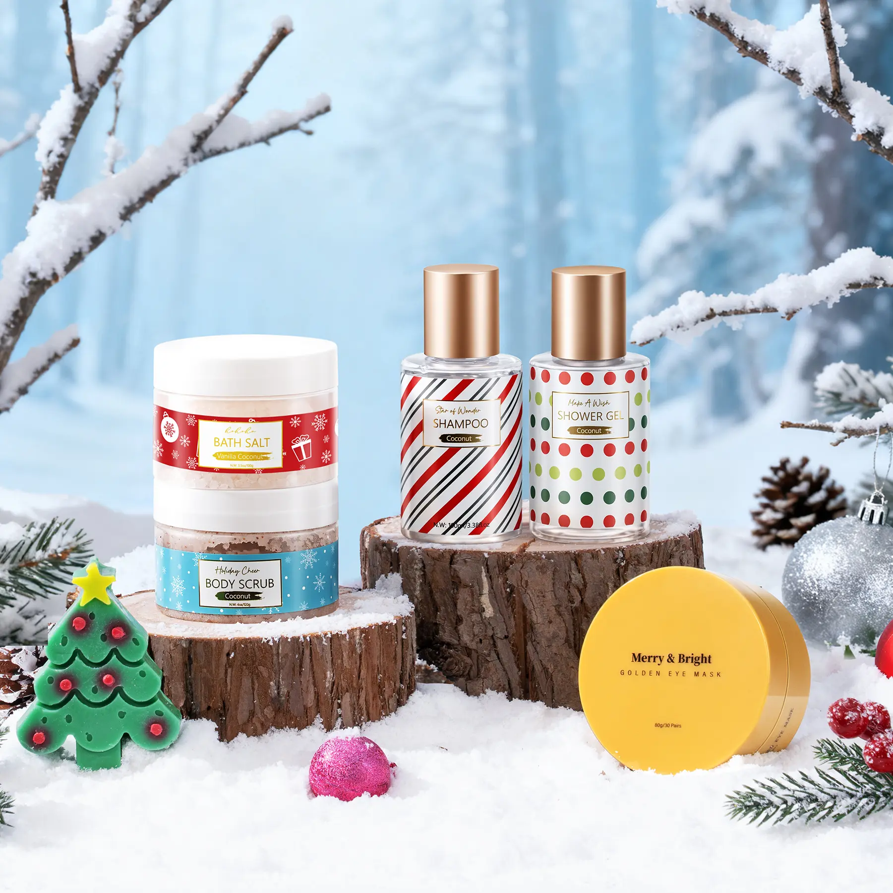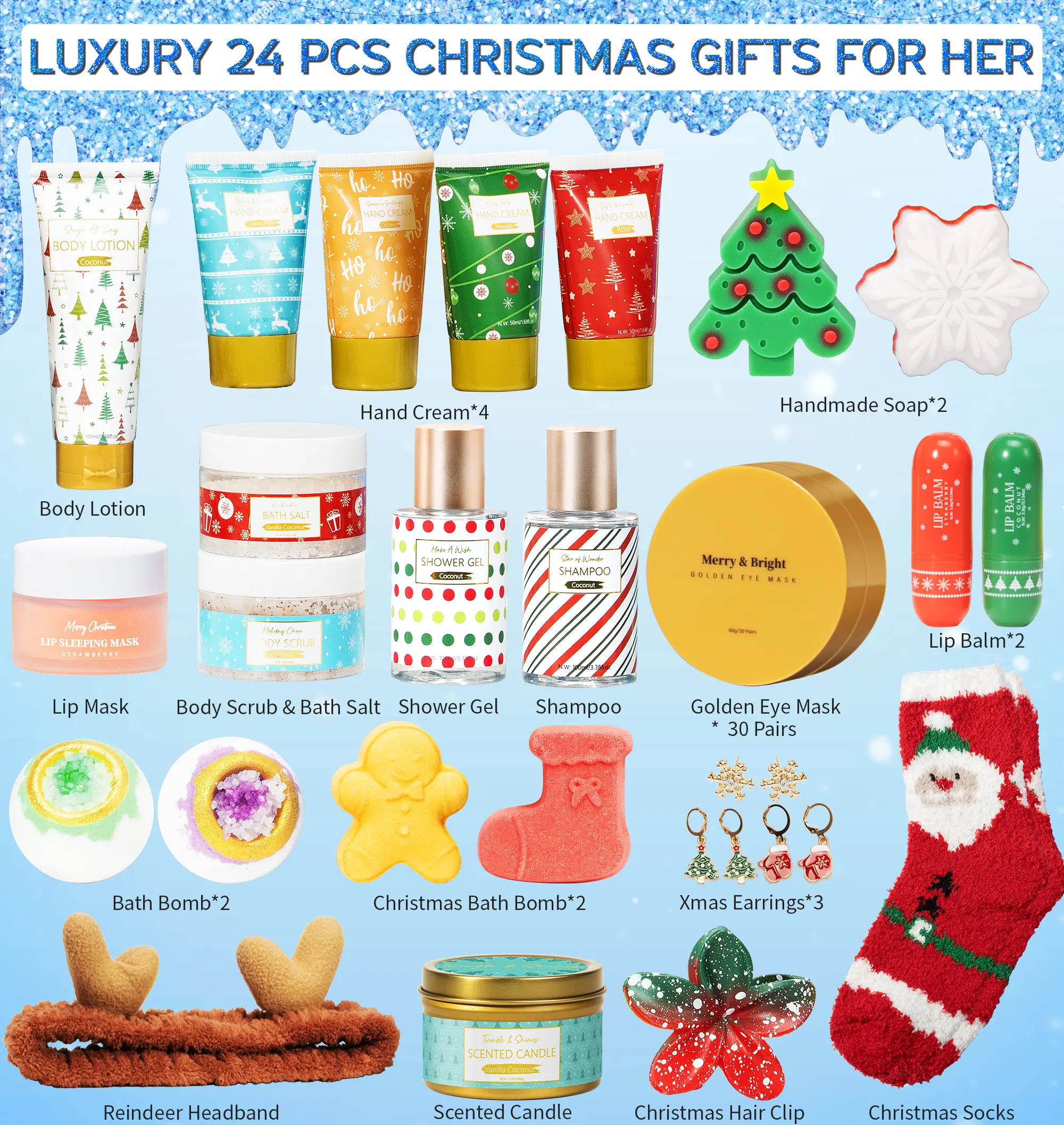 This advent beauty calendar 2025 provides 24PCS spa & bath items, including hand lotions, body scrub, body lotion, shower gel, shampoo, bath salt, and star and stocking-shaped bath bombs and Christmas tree and snowflake shaped handmade soaps.