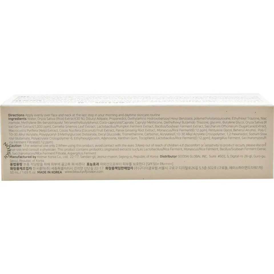 | Ingredients | Water (Aqua), Dibutyl Adipate, Propanediol, Diethylamino Hydroxybenzoyl Hexyl Benzoate, Polymethylsilsesquioxane, Ethylhexyl Triazone, Niacinamide, Methylene Bis-Benzotriazolyl Tetramethylbutylphenol, Coco-Caprylate/Caprate, Caprylyl Methicone, Diethylhexyl Butamido Triazone, Glycerin, 1,2-Hexanediol, Butylene Glycol, Oryza Sativa (Rice) Extract (30,000 ppm), Oryza Sativa (Rice Germ) Extract (2 ppm), Camellia Sinensis Leaf Extract, Lactobacillus/Cucurbita Pepo (Pumpkin) Ferment Extract, Bacillus/Soybean Ferment Extract, Saccharum Officinarum (Sugarcane) Extract, Macrocystis Pyrifera (Giant Kelp) Extract, Cocos Nucifera (Coconut) Fruit Extract, Panax Ginseng Root Extract, Camellia Sinensis (Black Tea) Extract, Monascus/Rice Ferment (120 ppb), Behenyl Alcohol, Poly(C10-30) Alkyl Acrylate, Polyglyceryl-3 Methylglucose Distearate, Decyl Glucoside, Tromethamine, Carbomer, Acrylates/C10-30 Alkyl Acrylate Crosspolymer, Sodium Stearoyl Glutamate, Polyacrylate Crosspolymer-6, Adenosine, Xanthan Gum, t-Butyl Alcohol, Tocopherol, Lactobacillus/Rice Ferment (120 ppb), Aspergillus Ferment, Yeast/Rice Ferment Filtrate (120 ppb), Pentylene Glycol, Ethylhexylglycerin |
