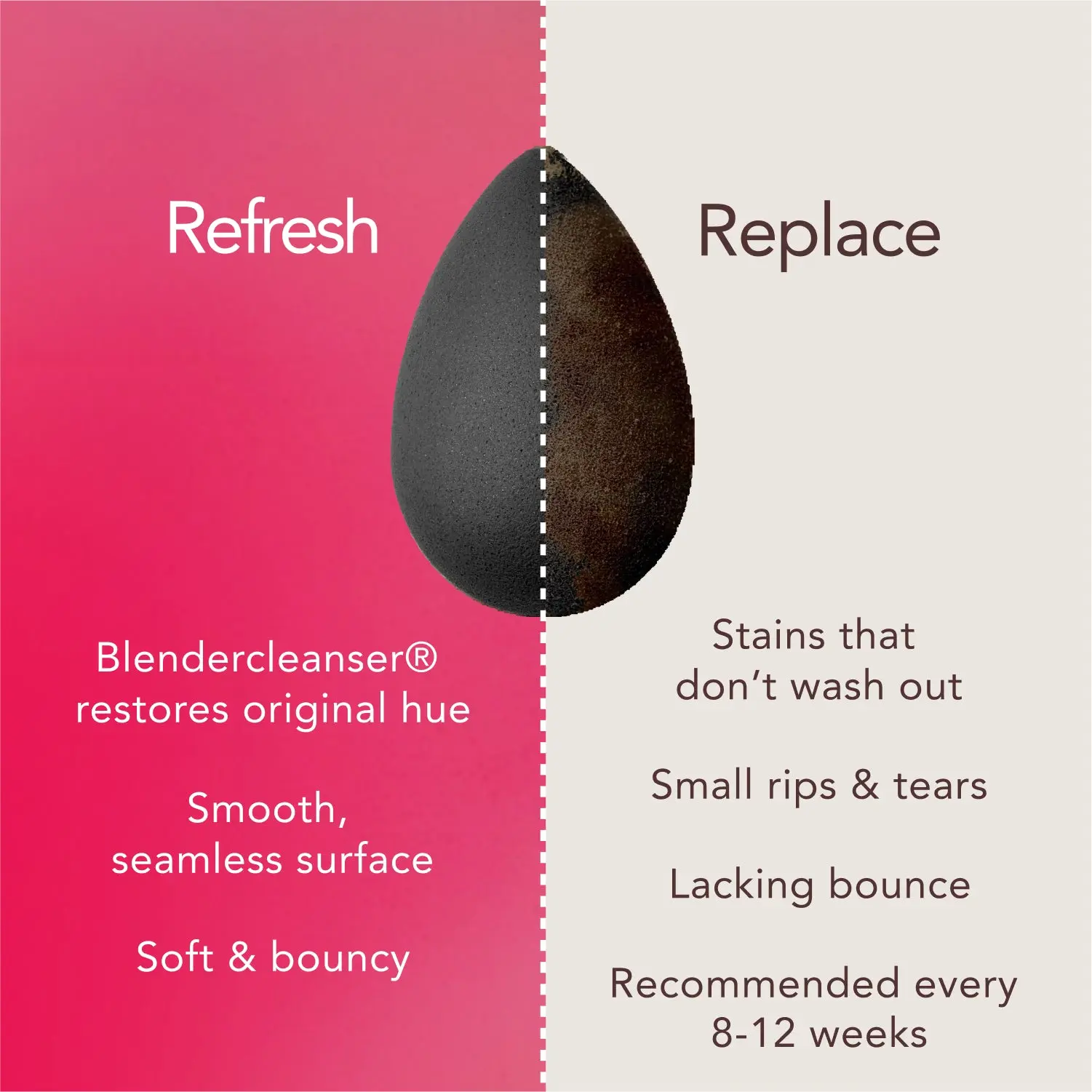 YOUR SIGN TO REPLACE HER 👁️👄👁️ If you didn’t already see yesterday’s reel, go check it out for some helpful @Original Beautyblender cleaning tips! But no matter how you clean a beauty sponge, you’ll eventually need to replace it… Take this as your sign to replace if it’s been more than a few months!  Notice how smooth, springy, and dense a new beautyblender is compared to your old one :’). Over time, they naturally break down and pieces can even come off while you’re applying your makeup. I’m not a brush gal because I find that my makeup looks more blended with a sponge. The extra hydration from the beauty sponge also helps my dry skin take to products more easily.