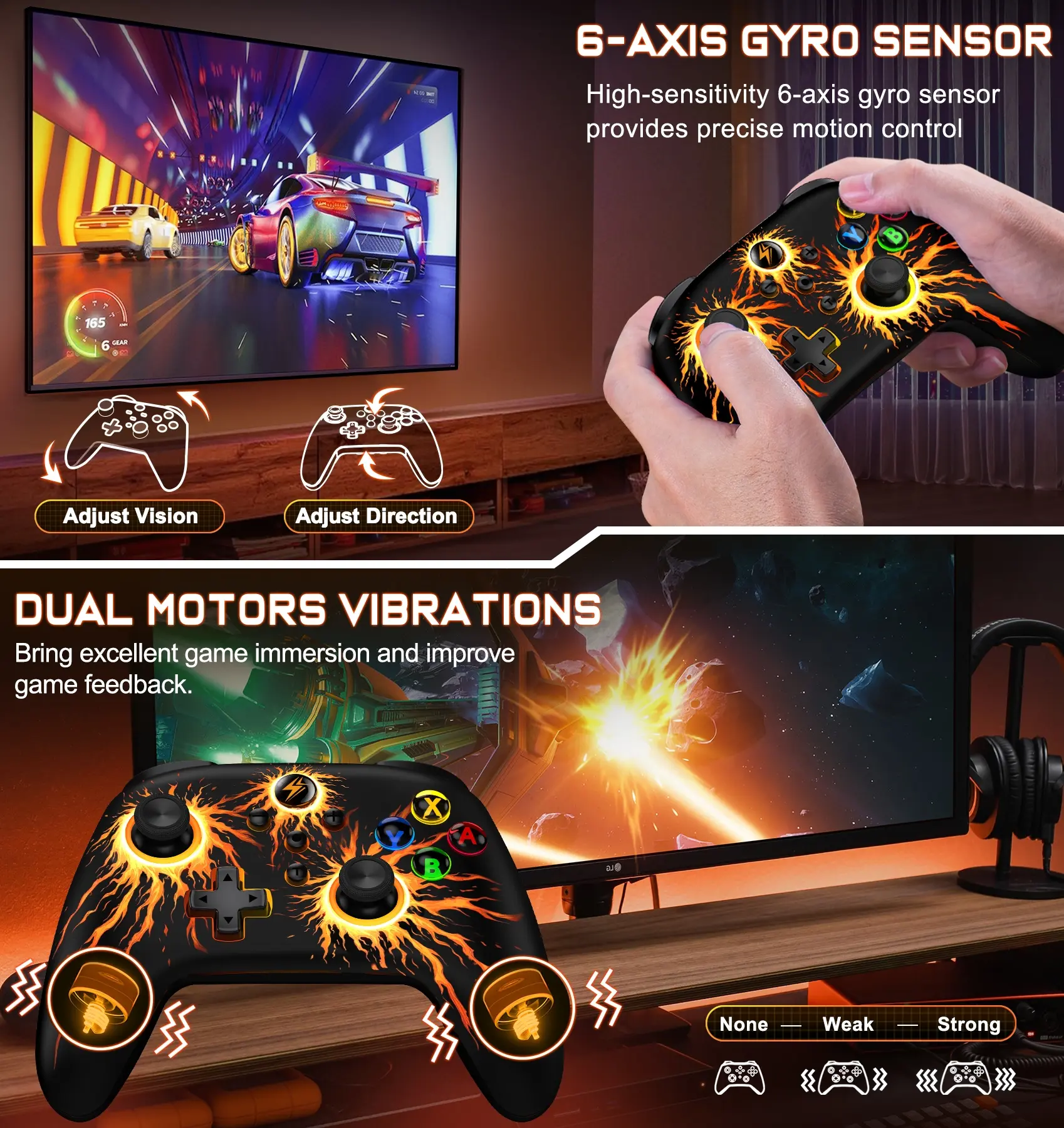 ·【VIBRATION FUNCTION ONLY FOR SWITCH/WINDOWS PC】Built-in dual vibration motors with 3-level vibration feedback: None, Weak and Strong. which provide you excellent vibration feedback to enhance the game immersion in switch games and windows pc computer games. Press and hold L, R, ZL, ZR at the same time to cycle through the vibration intensity.