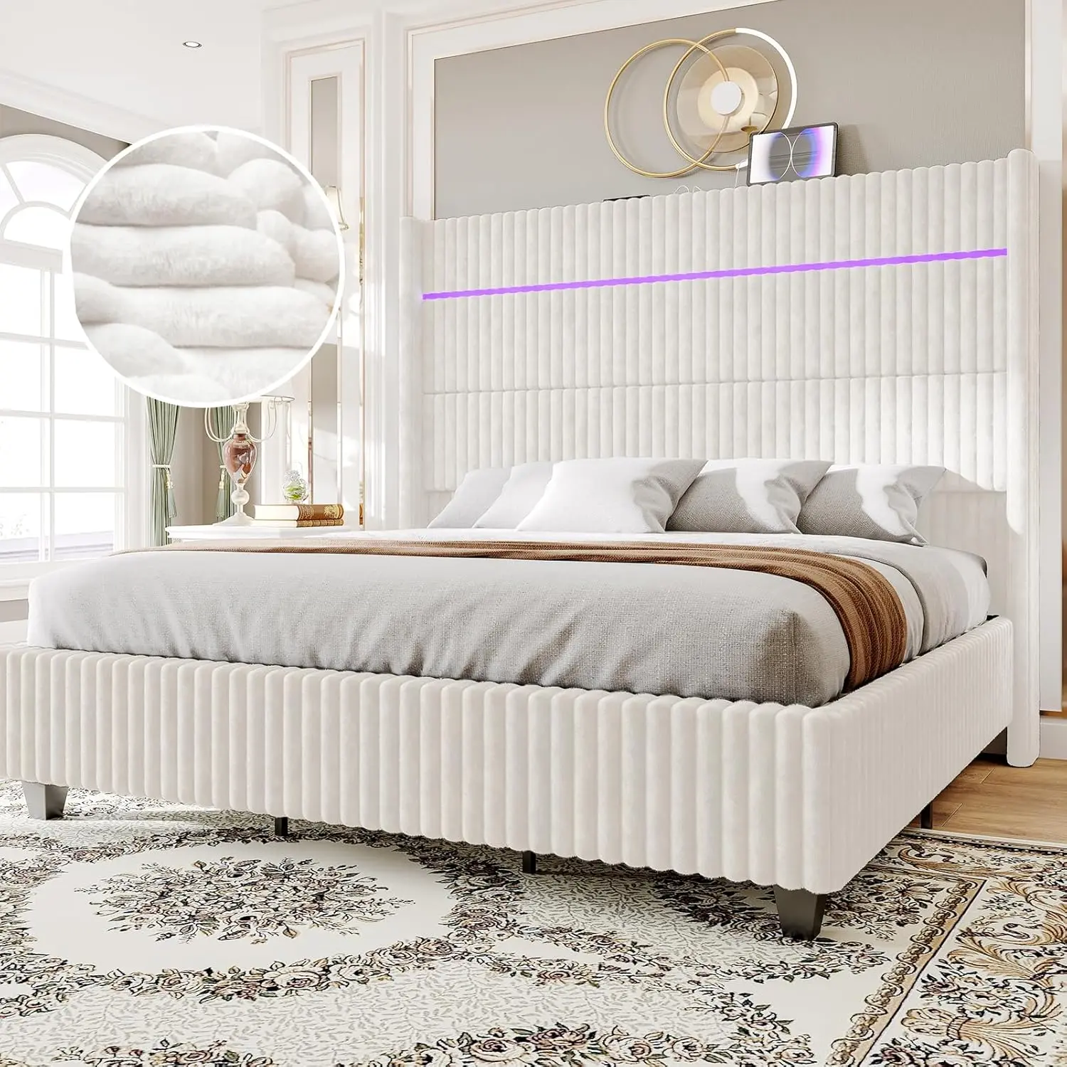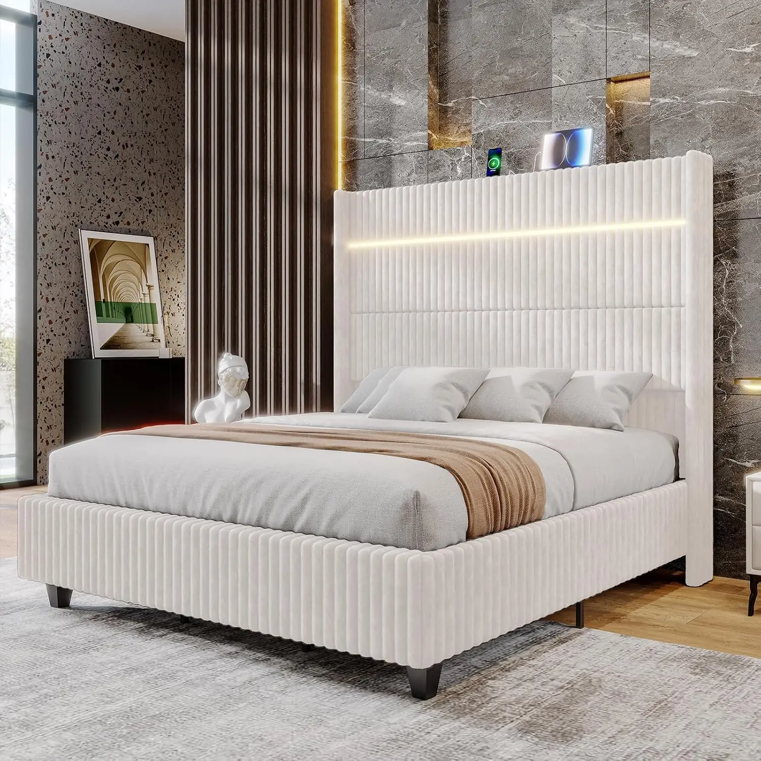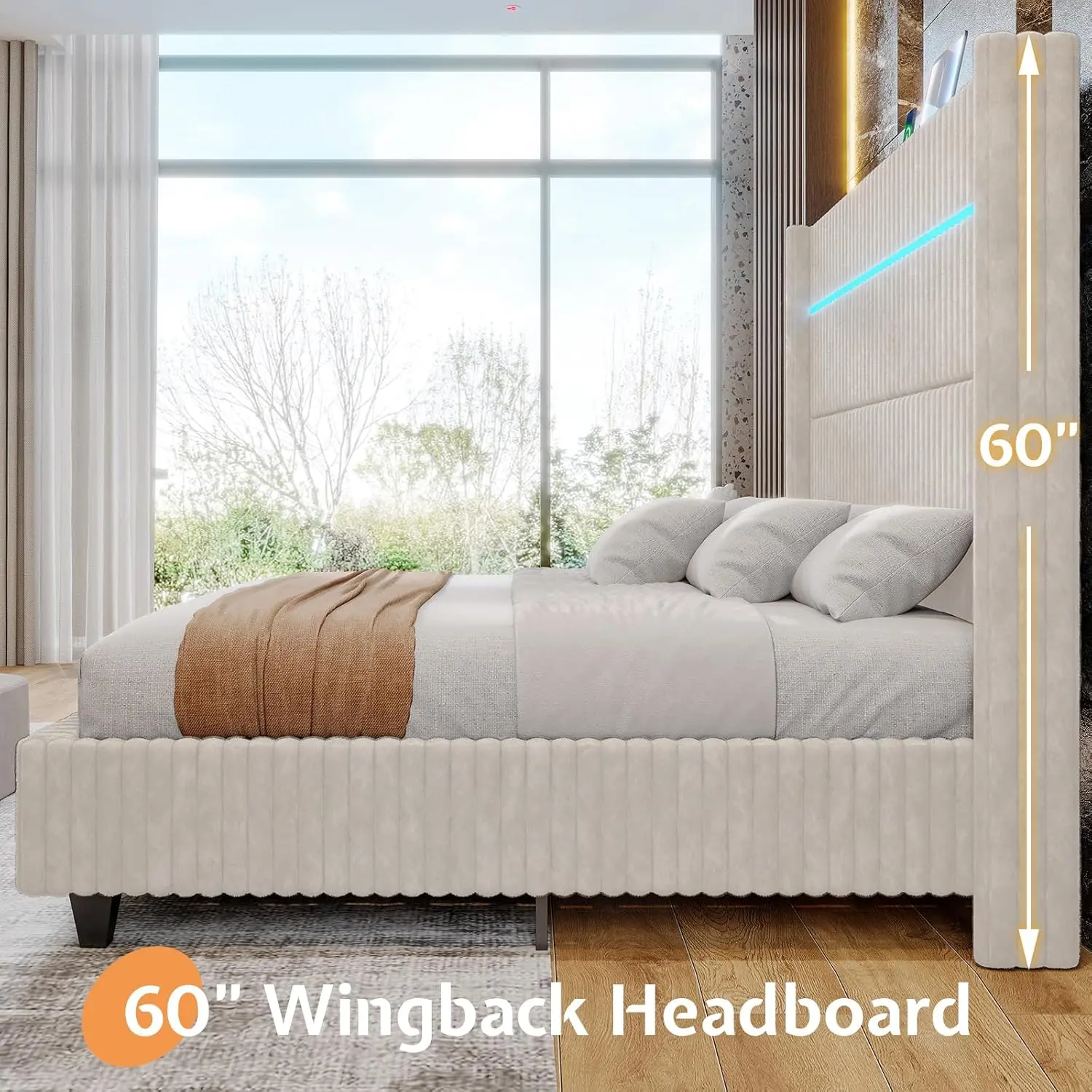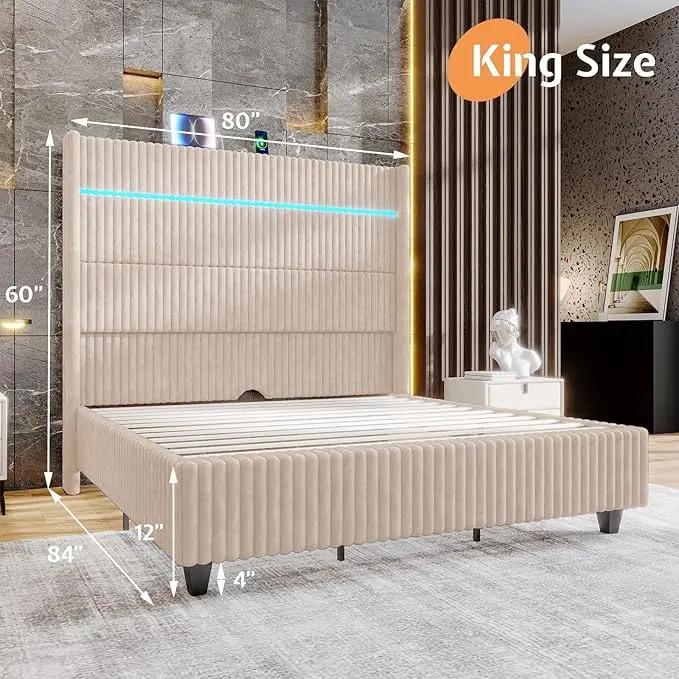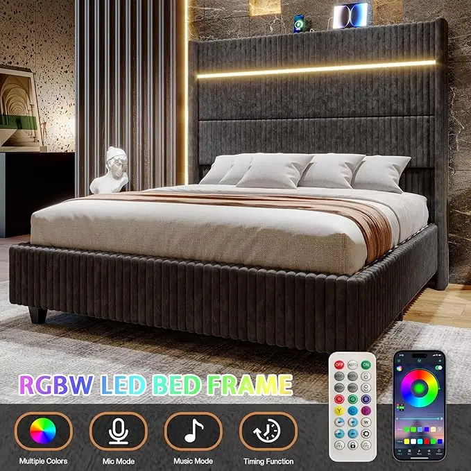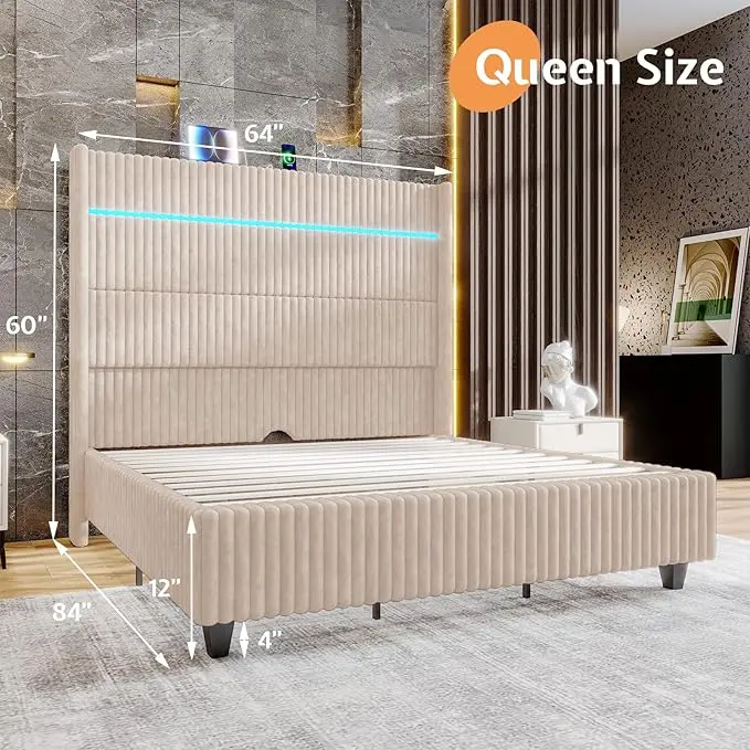 AMERLIFE Bed Frame with LED Lights Charging Station, Corduroy Upholstered Platform Bed Frame with 60" Tall Wingback Headboard/No Box Spring Needed,Best Gift Ideas/Christmas Gifts