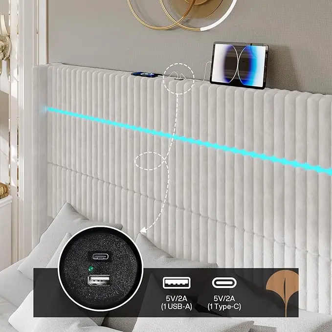 ·LED Bed Frame & Charging Station: Illuminate your nights with RGB LED lights to personalize your atmosphere. Coupled with a charging station, this king size bed frame ensures your devices are always powered, perfectly blending style with functionality.